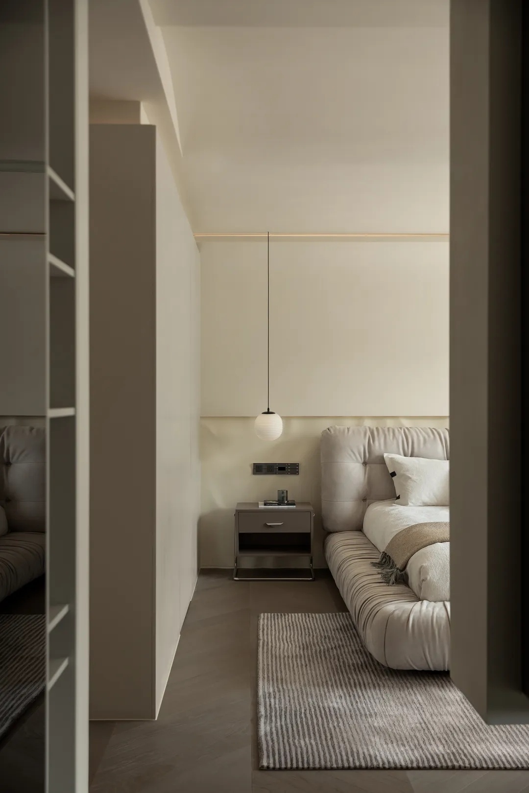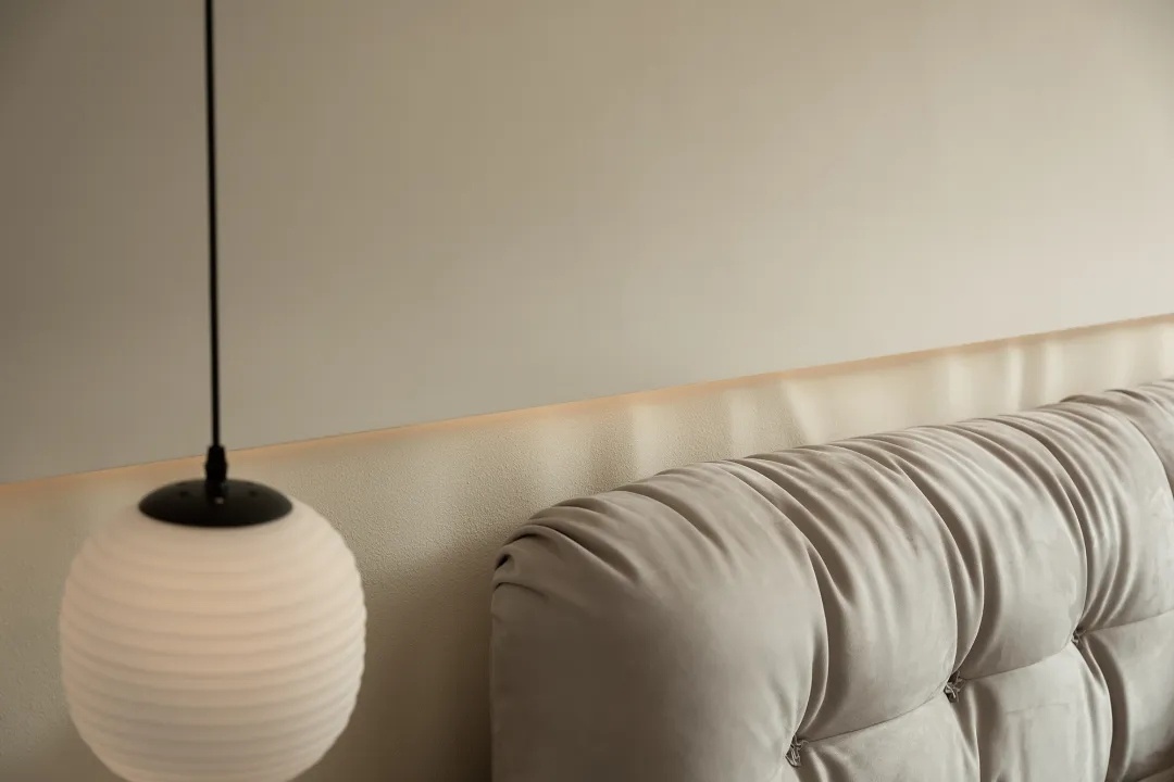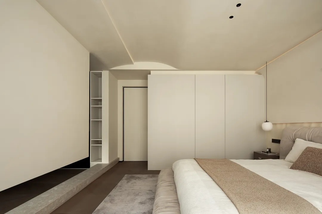 细节则暗藏设计巧思。背景墙以半面水波纹造型衔接简洁白墙,既与舒适酣眠的空间属性更加匹配,又在极简的设计主张下做出变化尝试,满足居住者的审美期待。而藏于隐形门背后的卫生间,墙顶结合处的层次处理……种种具体而微的细节,交汇成生活的丰富质感,与一种有别于其他空间、专属于家的情绪气息。