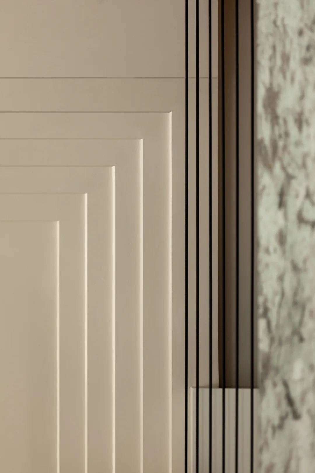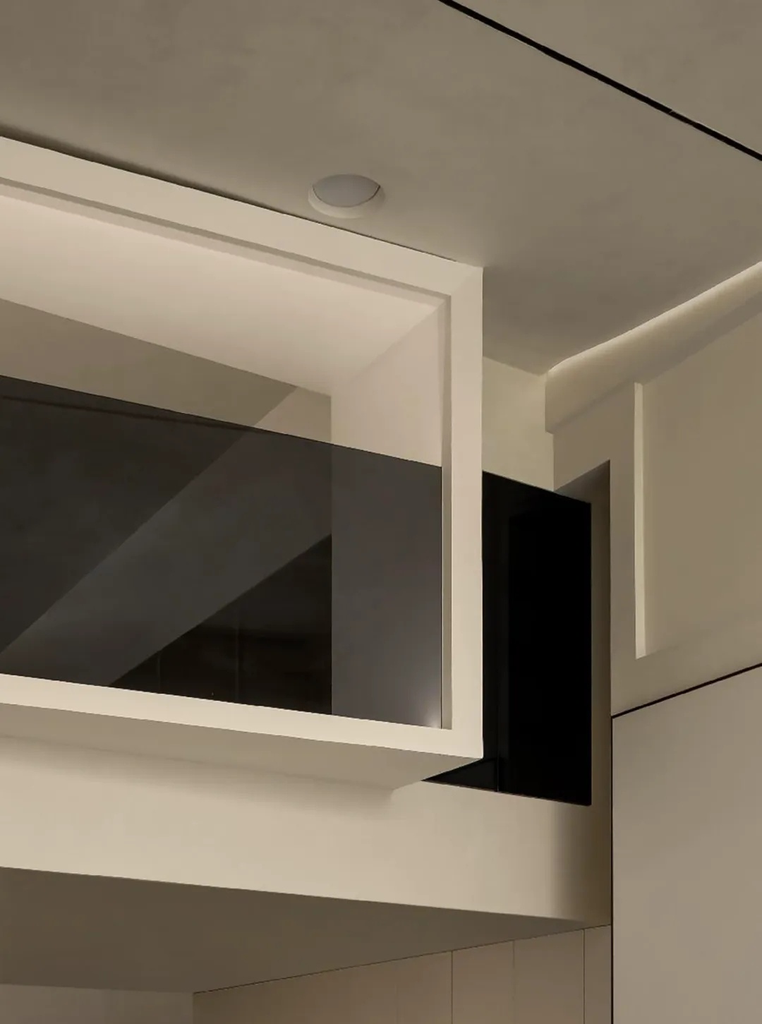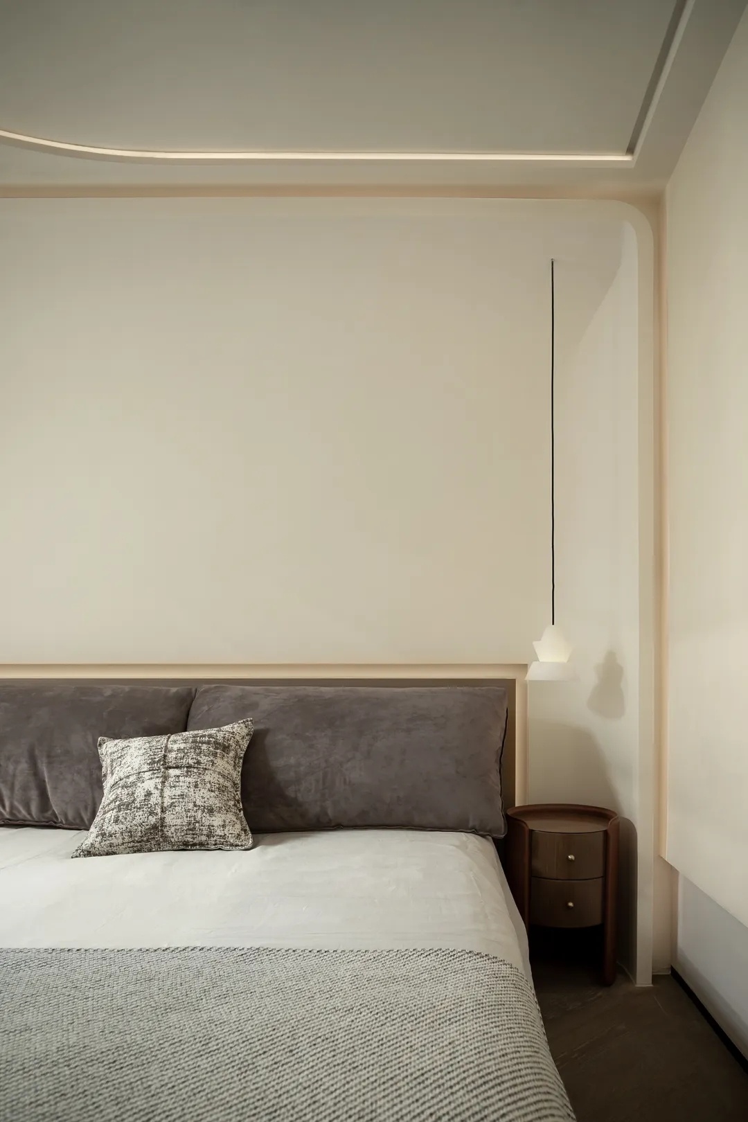 细节则暗藏设计巧思。背景墙以半面水波纹造型衔接简洁白墙,既与舒适酣眠的空间属性更加匹配,又在极简的设计主张下做出变化尝试,满足居住者的审美期待。而藏于隐形门背后的卫生间,墙顶结合处的层次处理……种种具体而微的细节,交汇成生活的丰富质感,与一种有别于其他空间、专属于家的情绪气息。