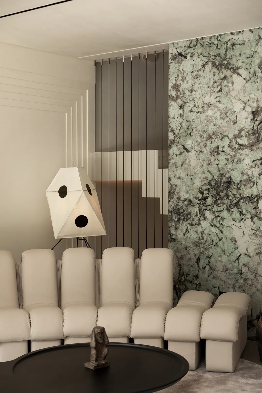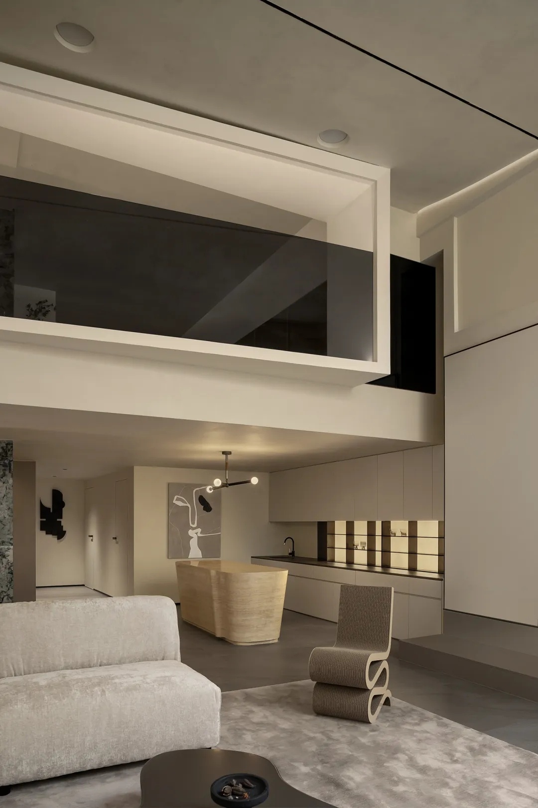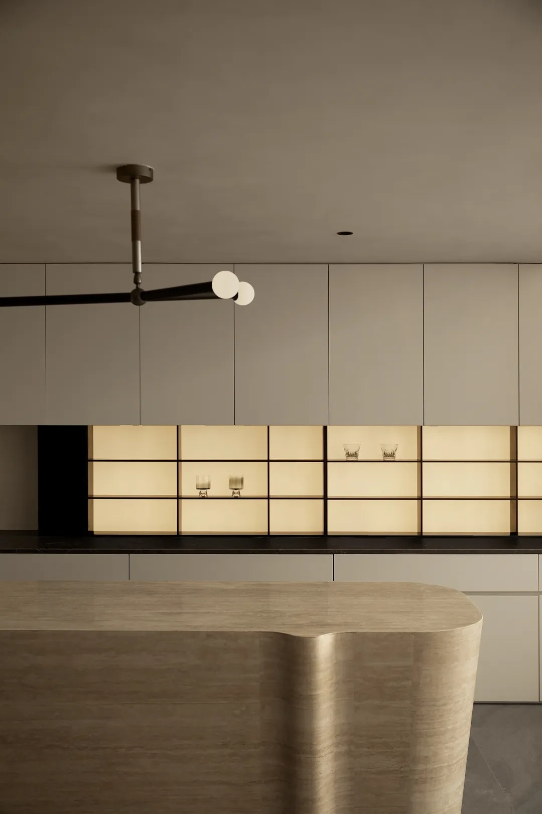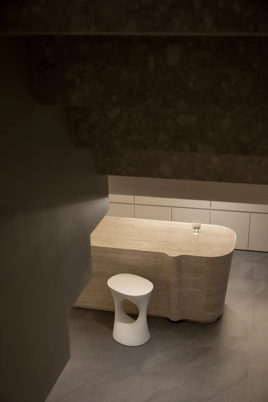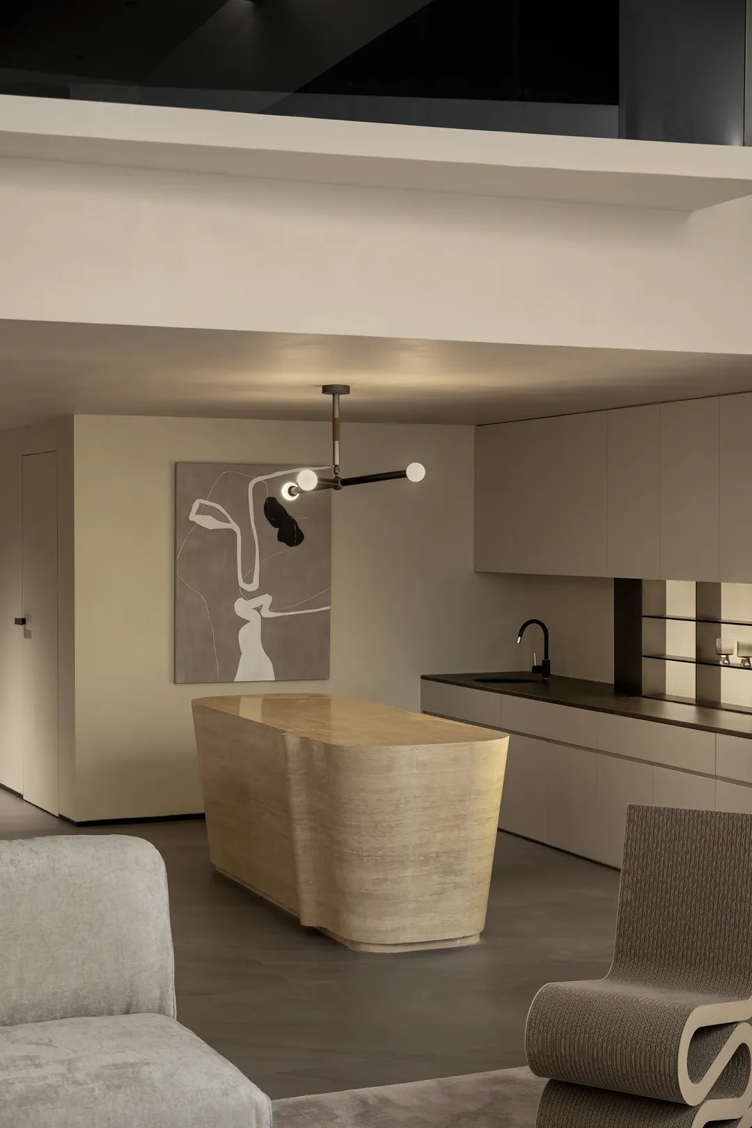 盒型结构的下方,一处精巧的mini吧填补空间留白。洞石吧台构建洄游式动线,其上的天然纹路搭配流动感造型,更加强化此间场景的轻快悠闲。