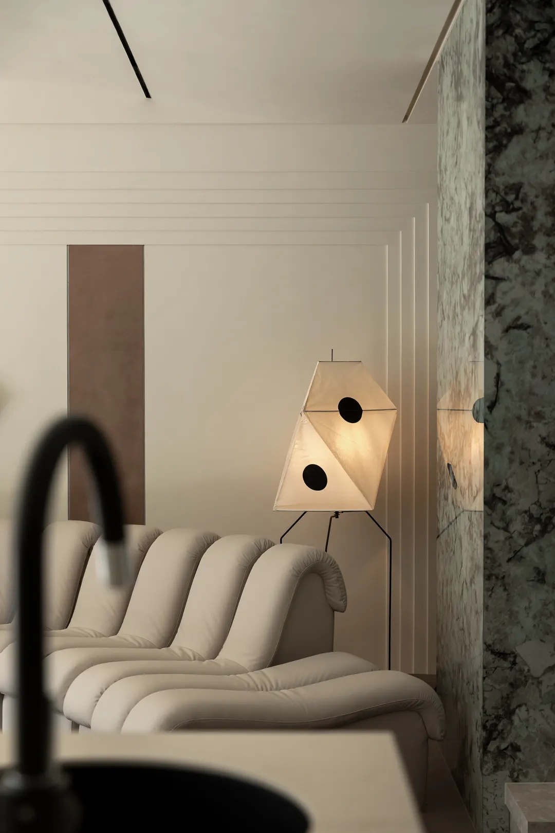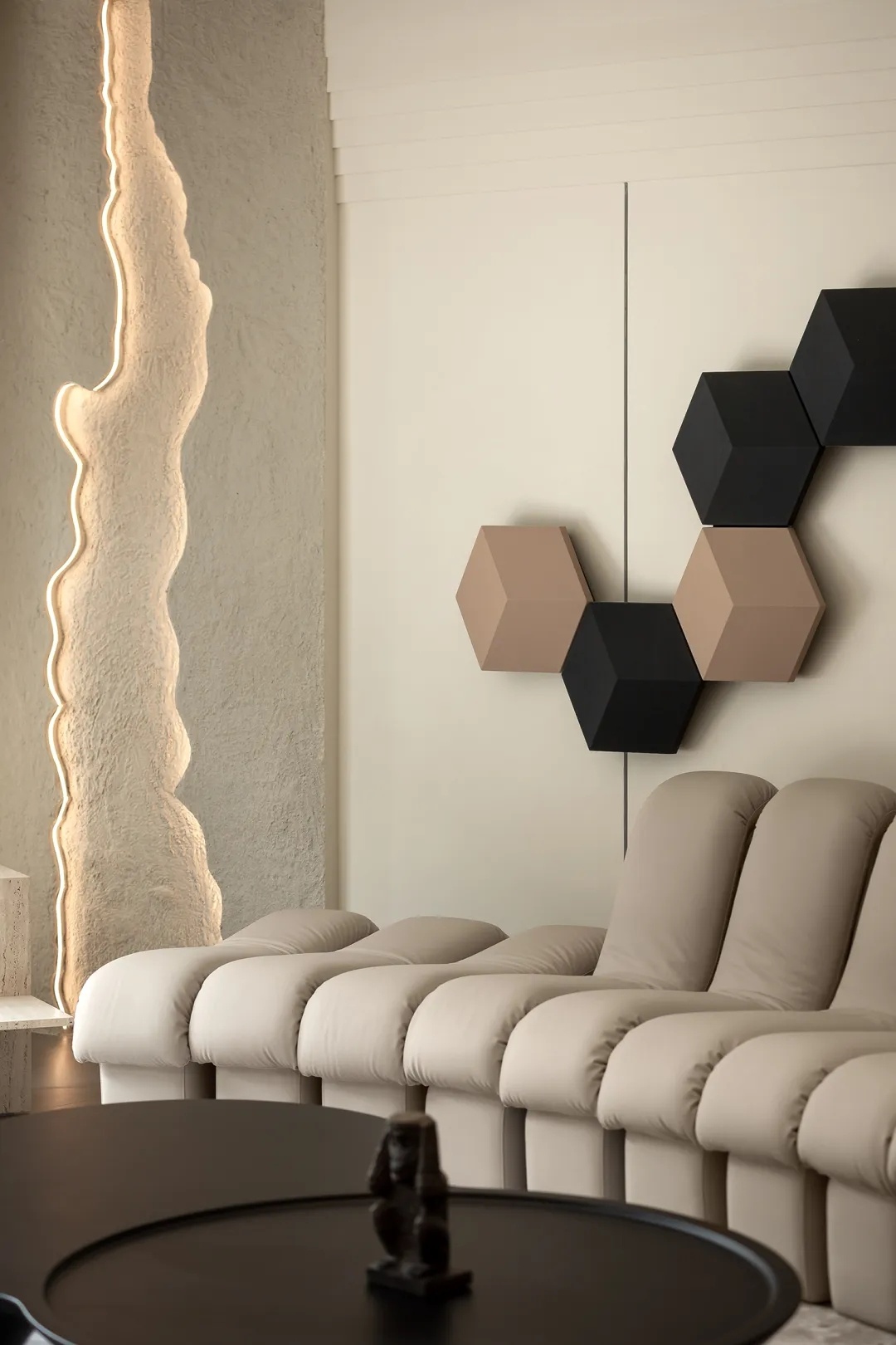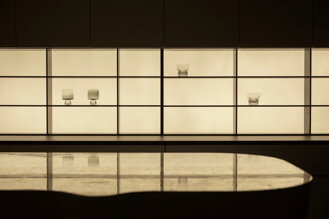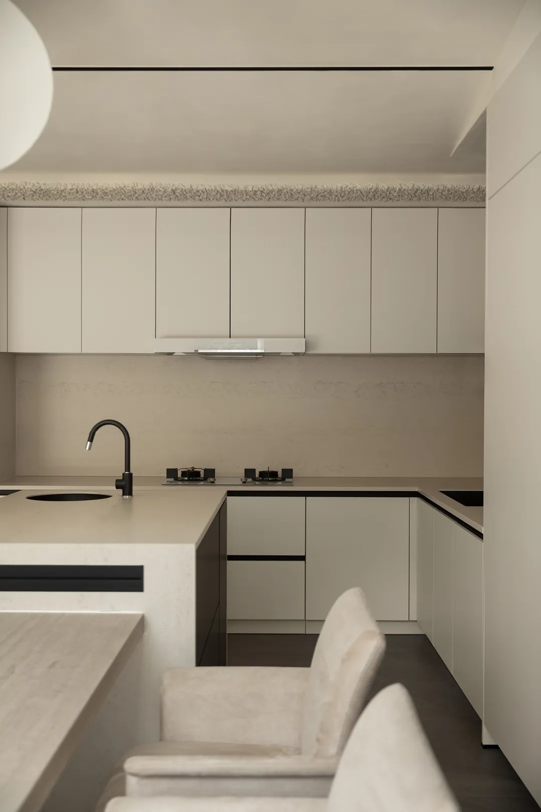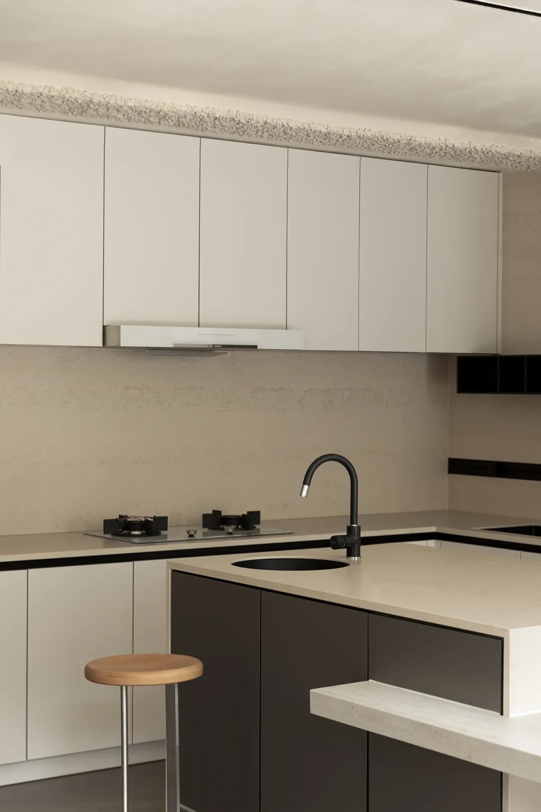 盒型结构的下方,一处精巧的mini吧填补空间留白。洞石吧台构建洄游式动线,其上的天然纹路搭配流动感造型,更加强化此间场景的轻快悠闲。
