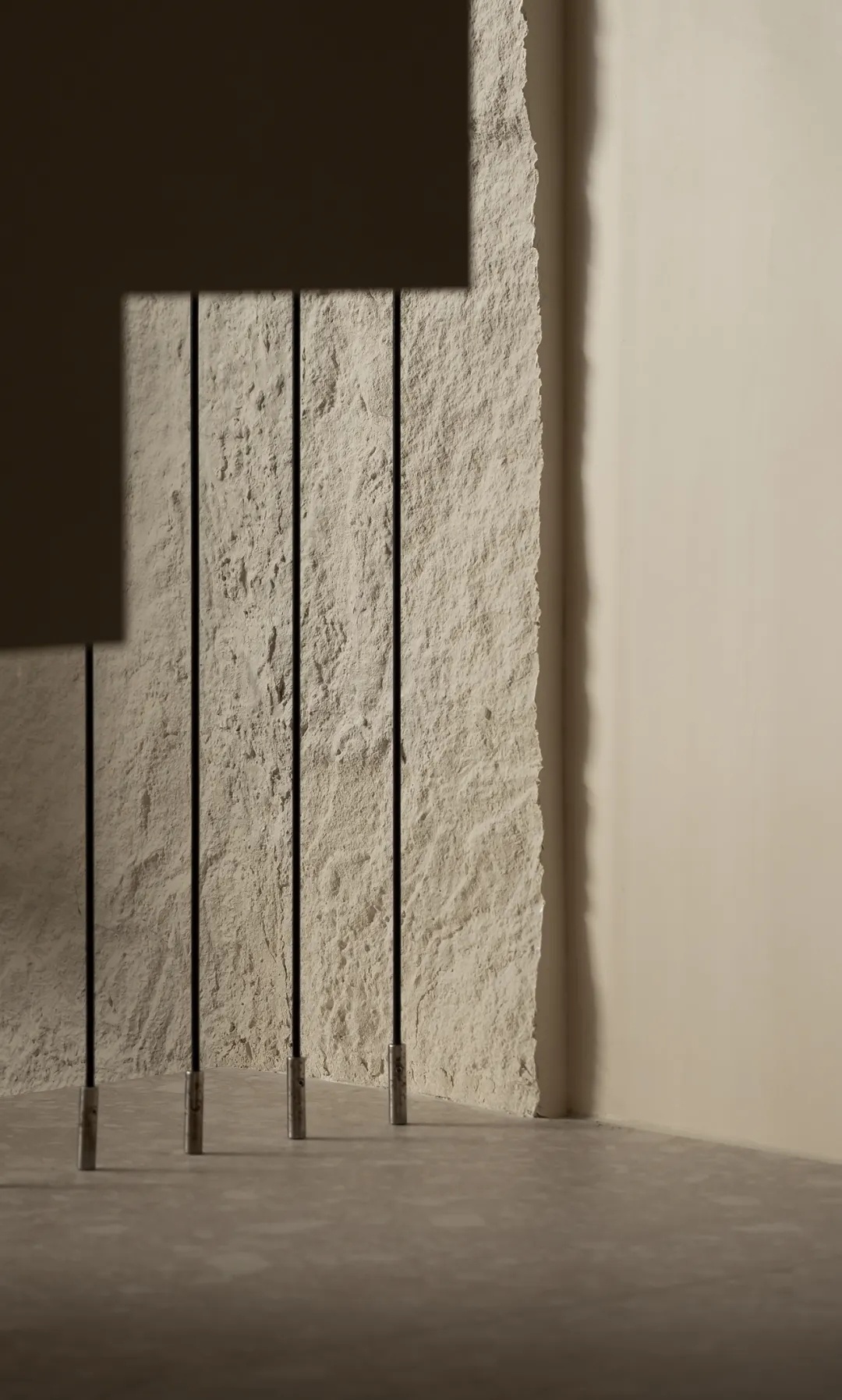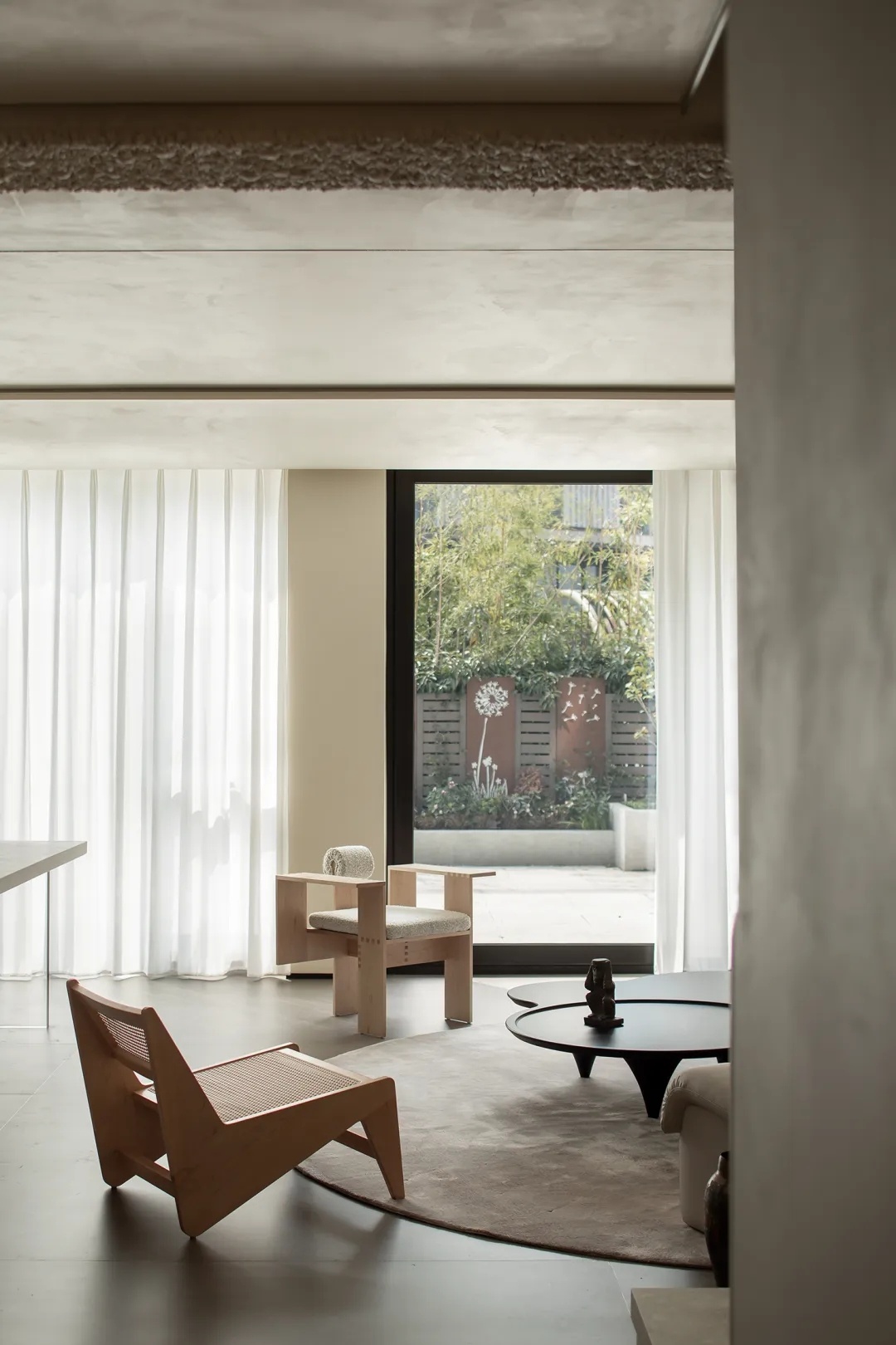 黑色皮质包裹钢丝,拉起线状楼梯扶手,其轻巧的形态打破空间阻隔,也与天然石材挡墙开启轻重得宜的结构对谈。空间承载生活与审美哲学,在张弛有度间,达至光影与氛围的平衡。