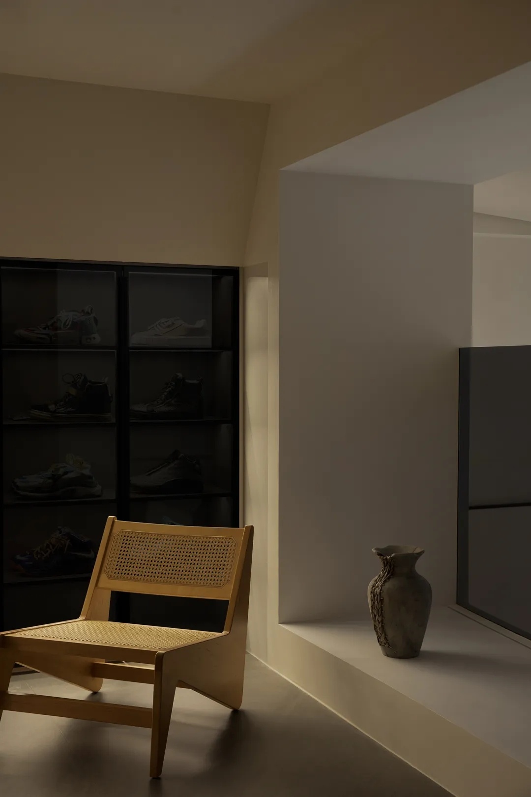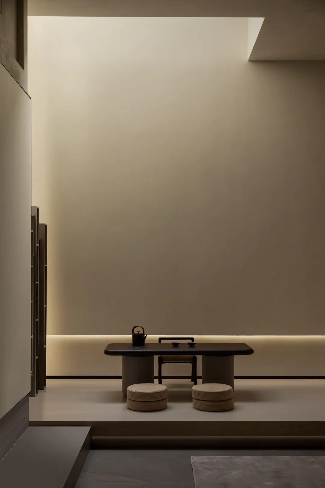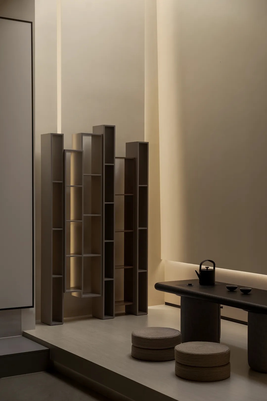 休闲区被地台围合,一组休闲沙发与造型单椅营造舒适娱乐氛围,男主人对于影音的热衷将在这个小场域得到极大满足。茶台刚好至于挑空之下,光影为简素的场景带来丰富变化,一侧的置物架以空为美,也是一种留待居住者陆续填满的生活留白。