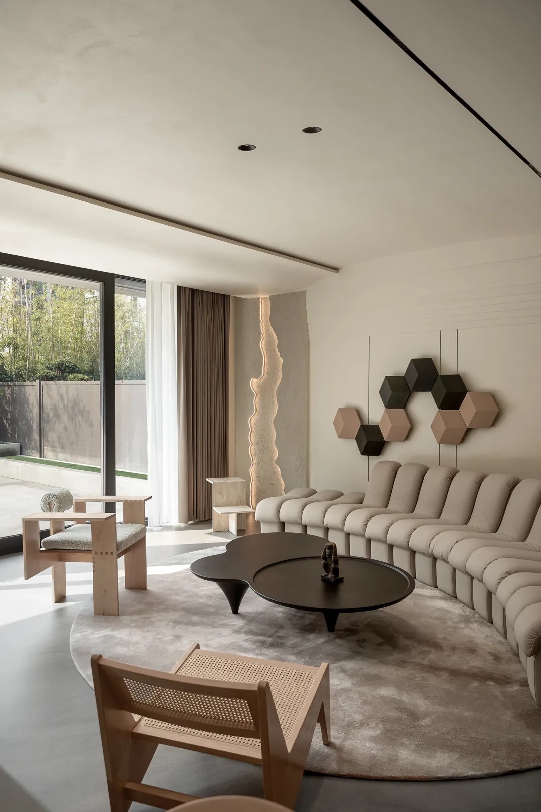 客厅位于一层,凝聚着家庭场景的核心公共属性。可灵活组合的模块化经典沙发偏安一角,为日常的休闲提供最佳庭院景观视角。而其流畅的线条感造型,也优雅介入——既有足够大的体量,平衡视觉,又不显笨拙,带来灵动且舒适的设计表达。