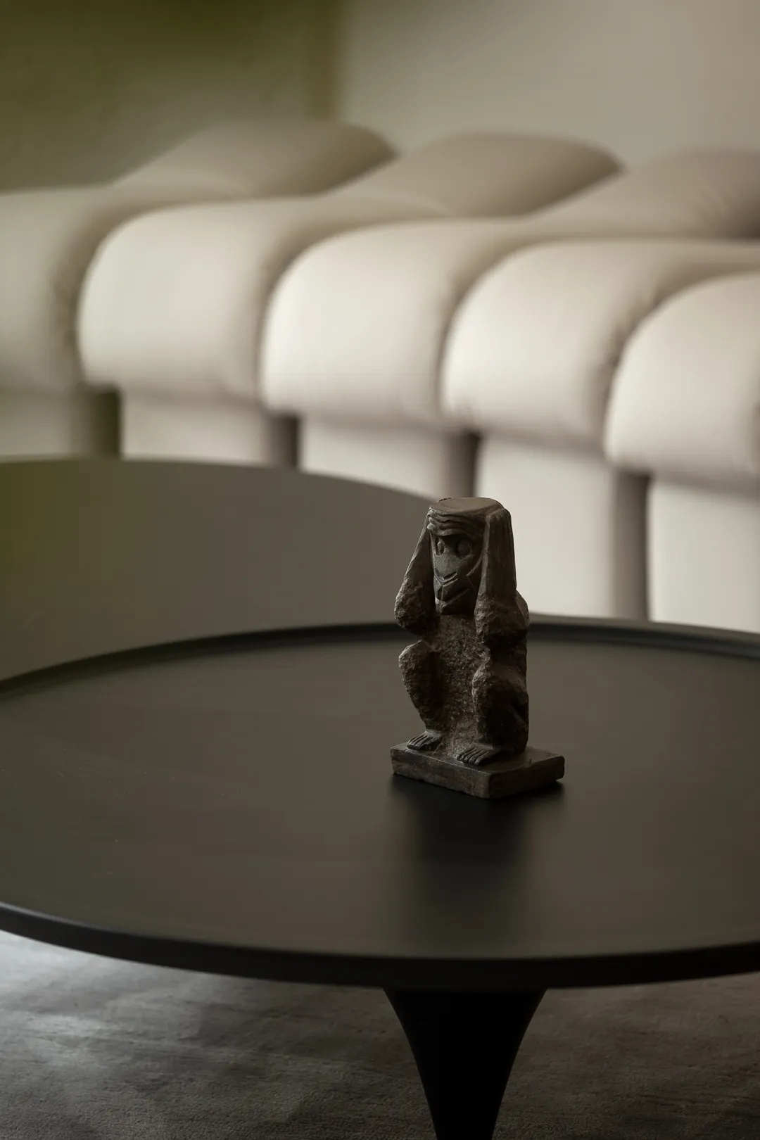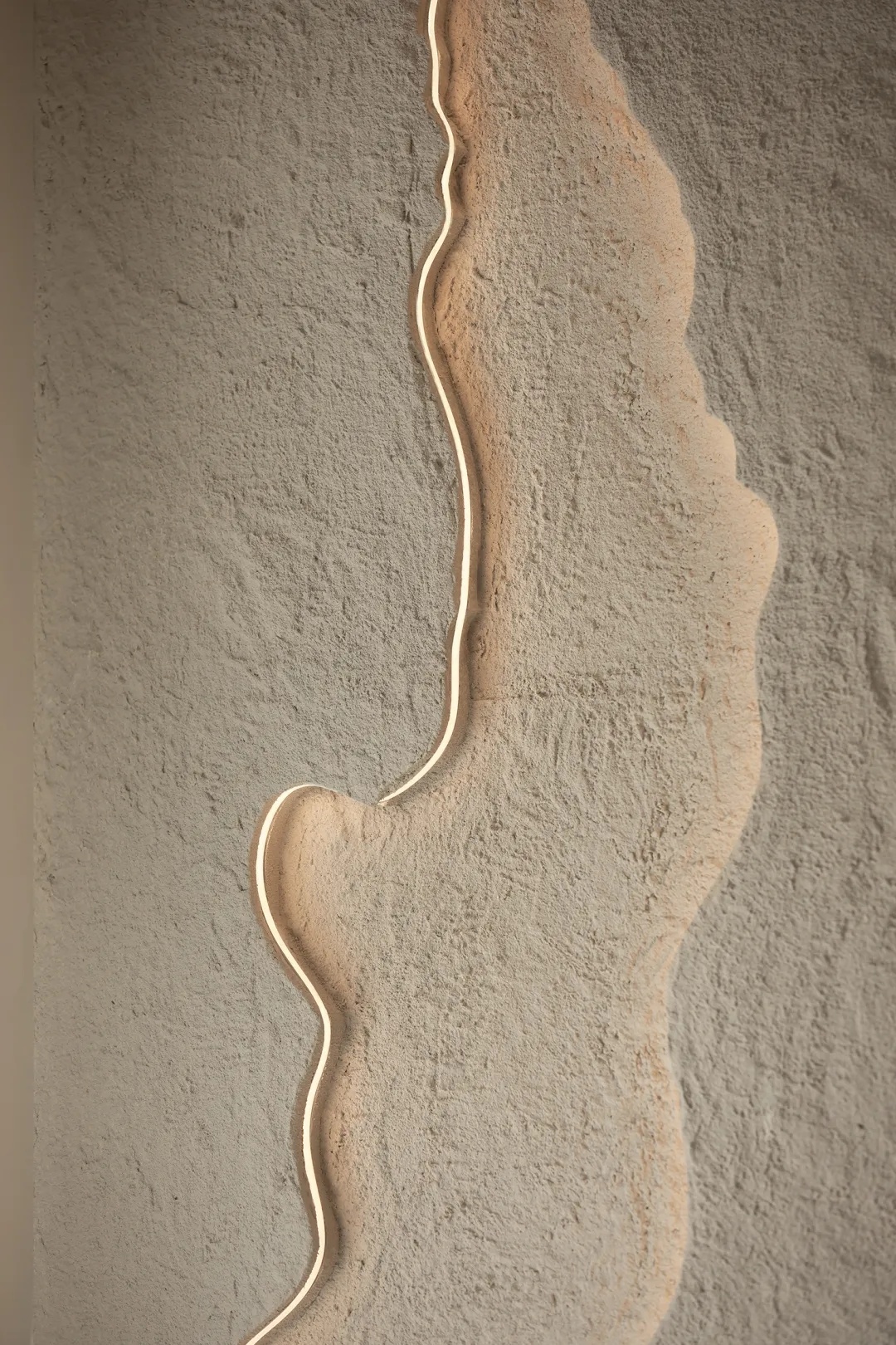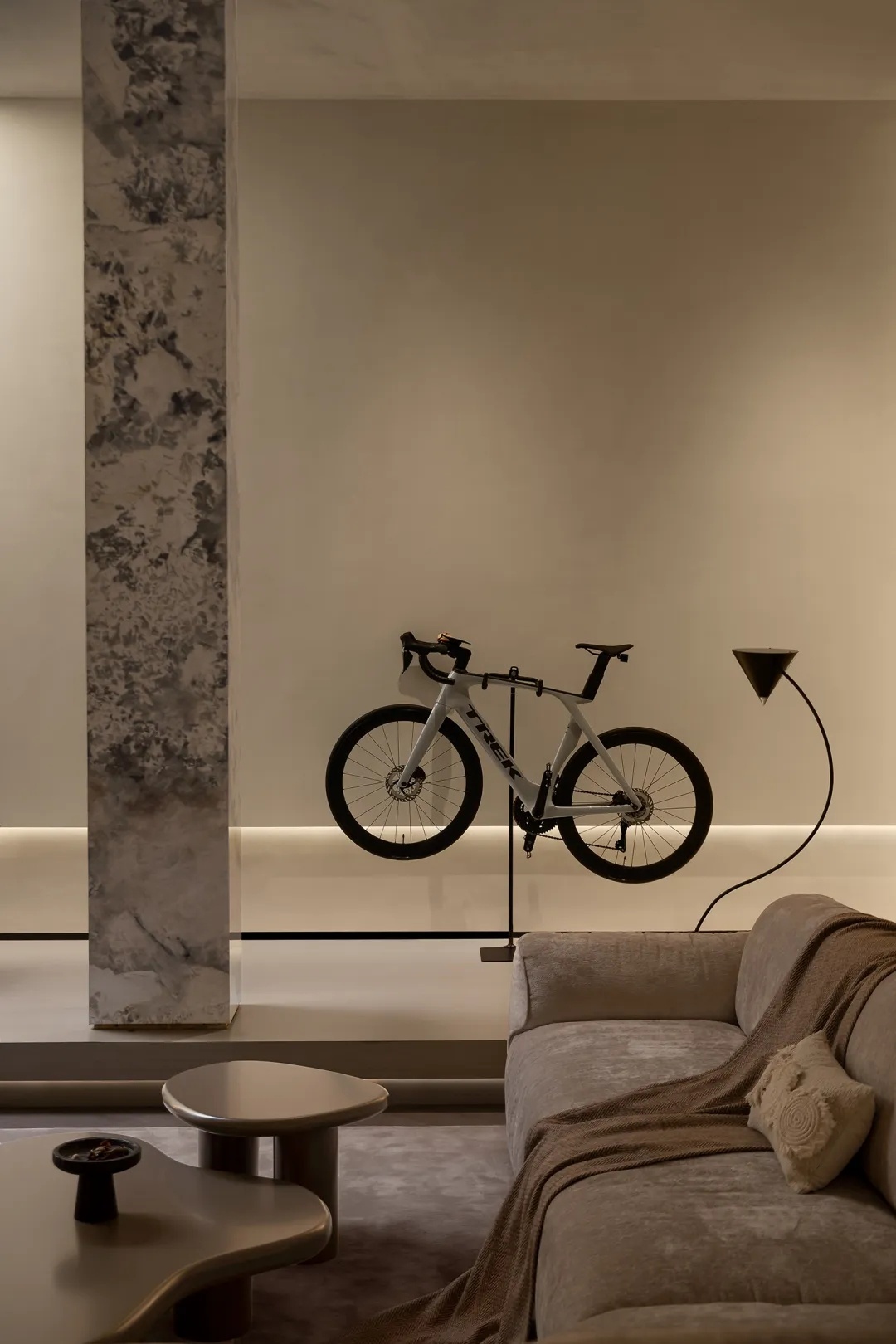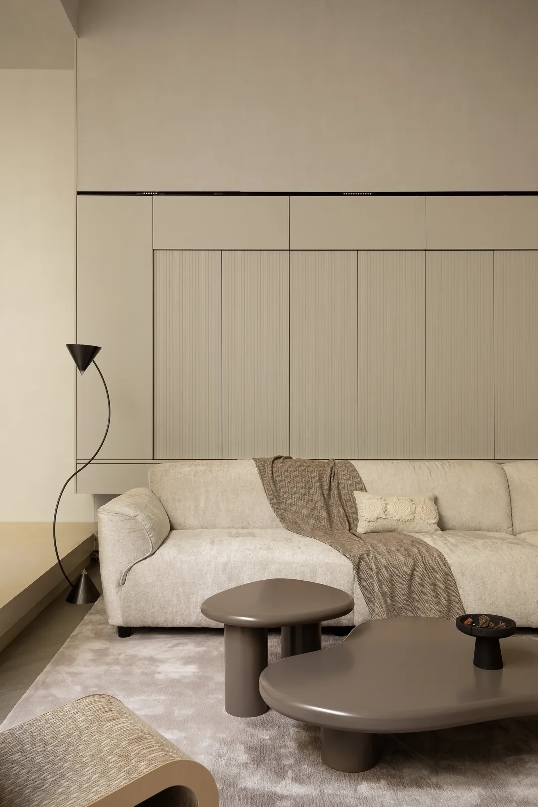 光影自落地窗向内渐进,背景墙以材质划定层次。混凝土的粗糙肌理暗示边界,一组兼具功能性与装饰性的音响设备才是视觉焦点。生活自天然的原始感过渡至细腻的品质感,一如灯光点亮混凝土饰面的“似水纹理”,也如随性流淌的美妙音乐萦绕日常,慰藉人心。