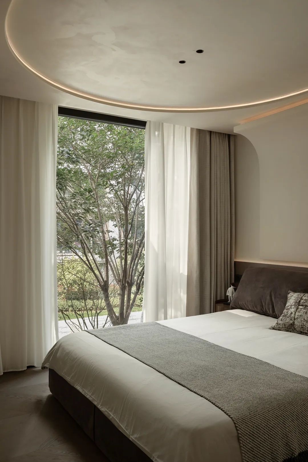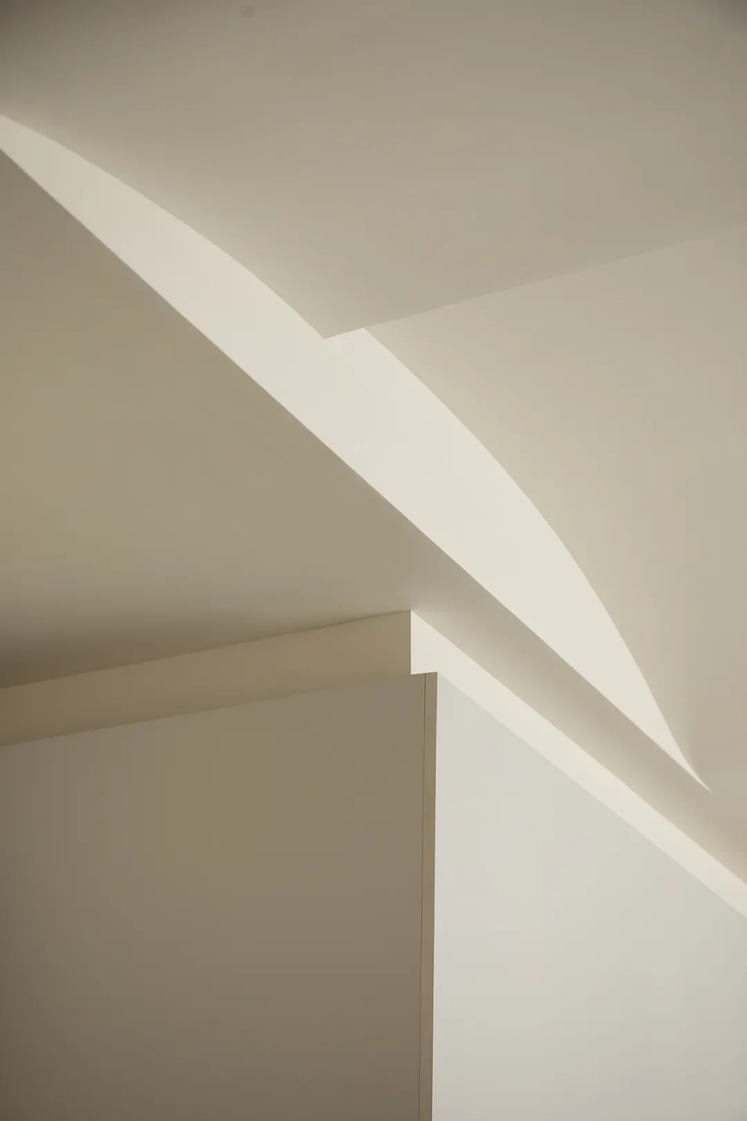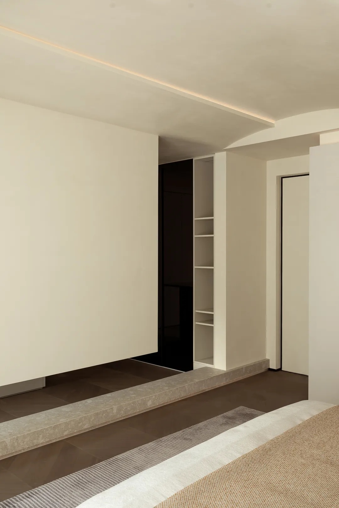 二层空间以主卧与尚未启用的儿童房为主。质感墙漆与洗练线条一路铺陈,天花板的弧度在理性为主的审美中植入柔和表达,结构的衔接处,线条交错呈现意外的光影美感。衣帽间以悬浮墙体与主卧构成嵌套关系,地梁进一步暗示二者界限,但流通的气韵却仍旧彰显着空间的整体性。