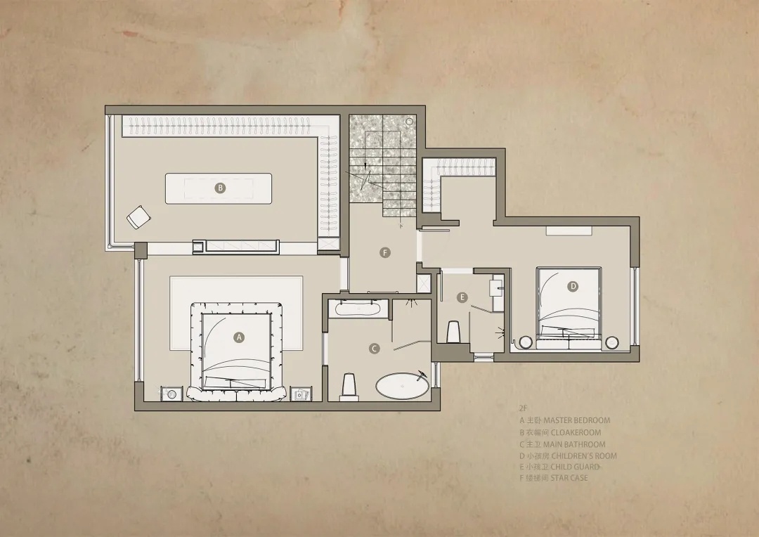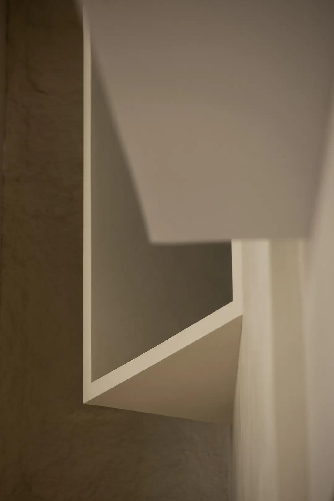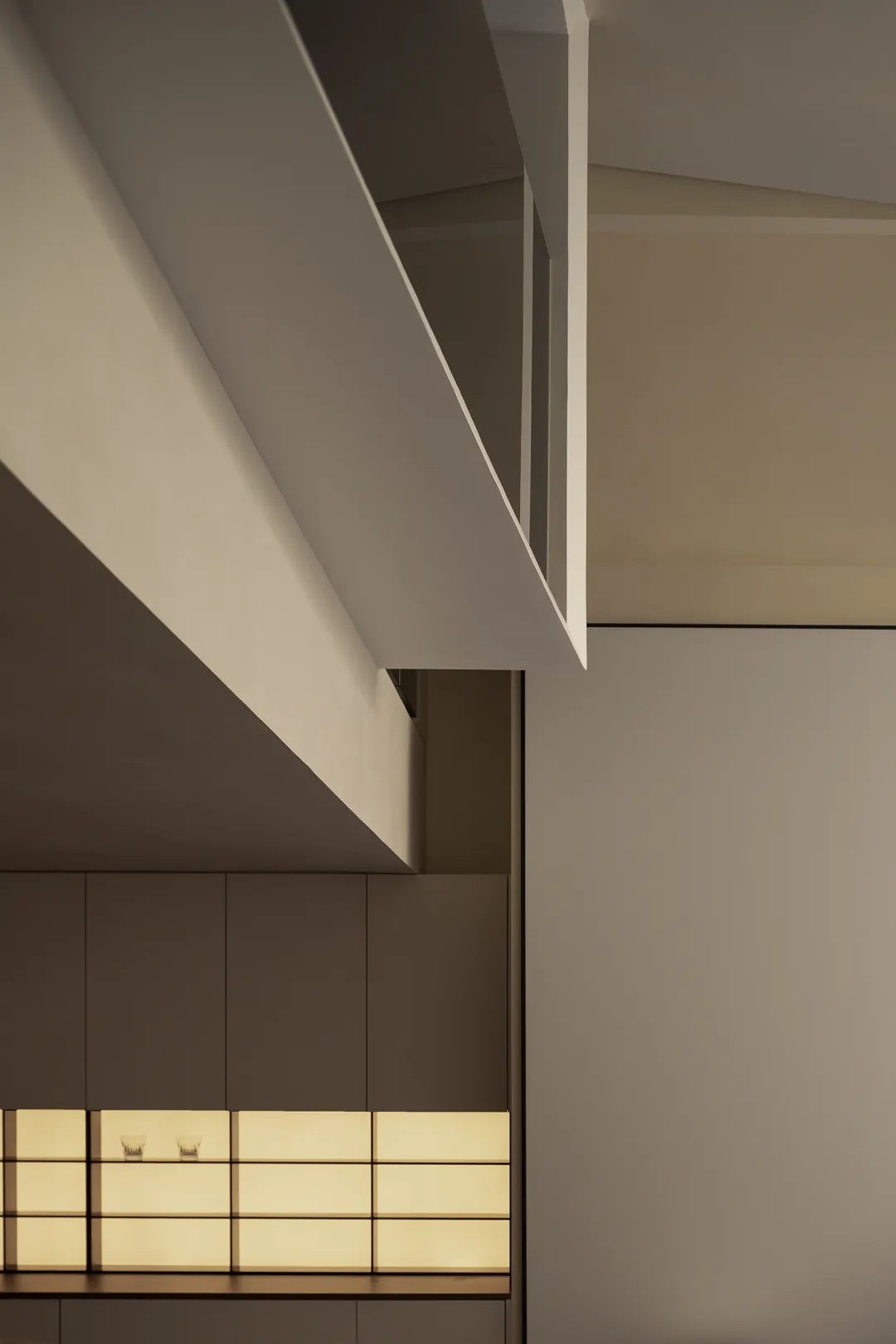 二层空间以主卧与尚未启用的儿童房为主。质感墙漆与洗练线条一路铺陈,天花板的弧度在理性为主的审美中植入柔和表达,结构的衔接处,线条交错呈现意外的光影美感。衣帽间以悬浮墙体与主卧构成嵌套关系,地梁进一步暗示二者界限,但流通的气韵却仍旧彰显着空间的整体性。