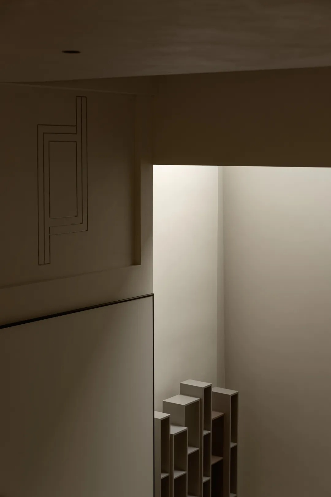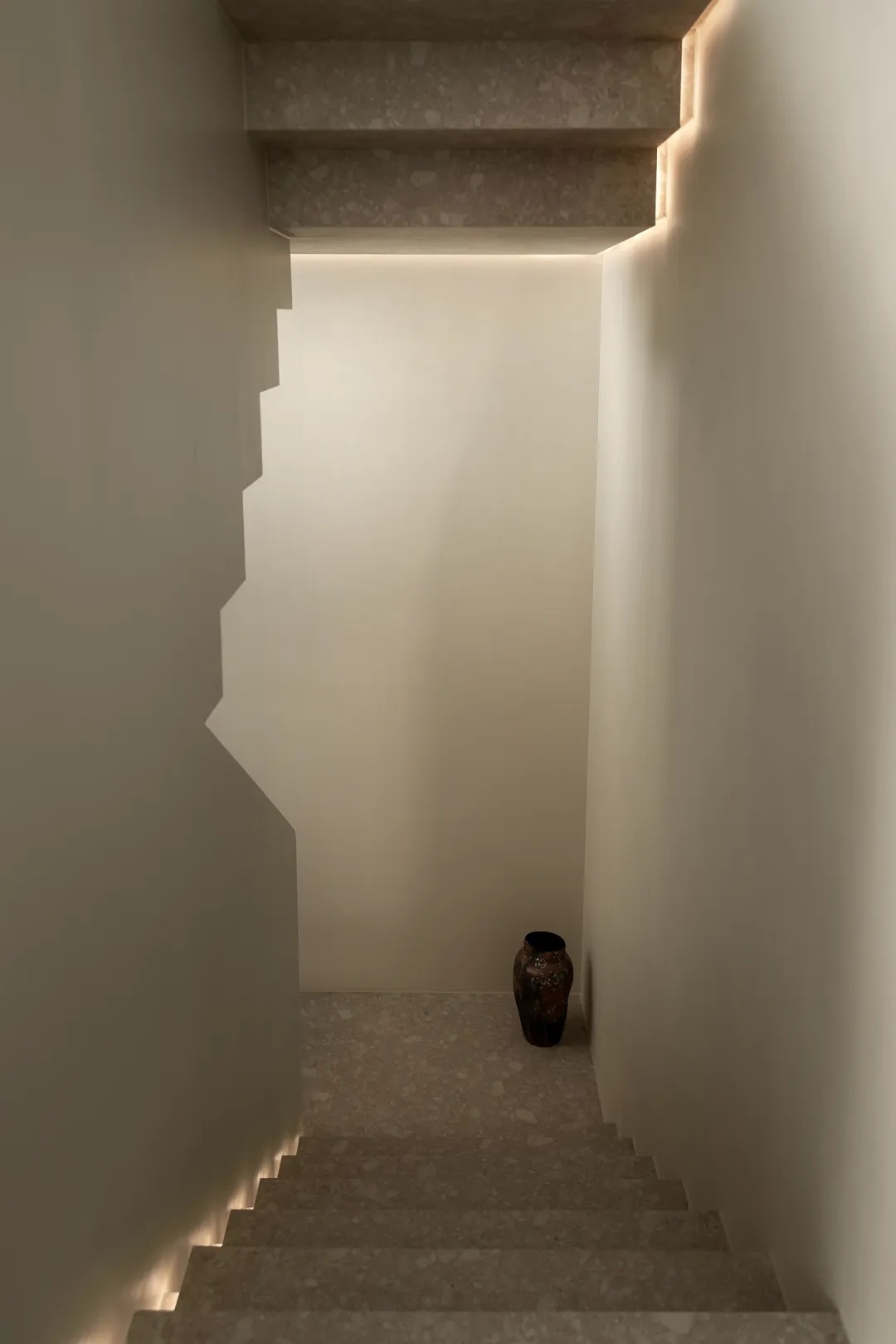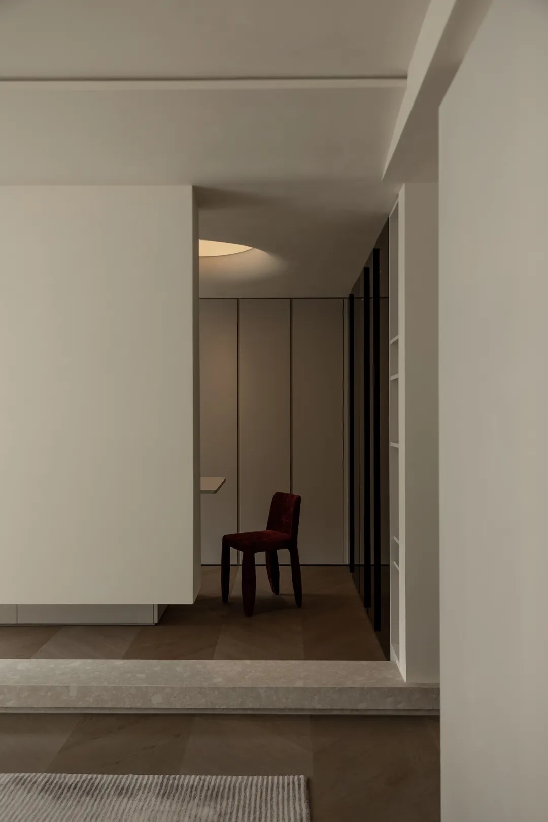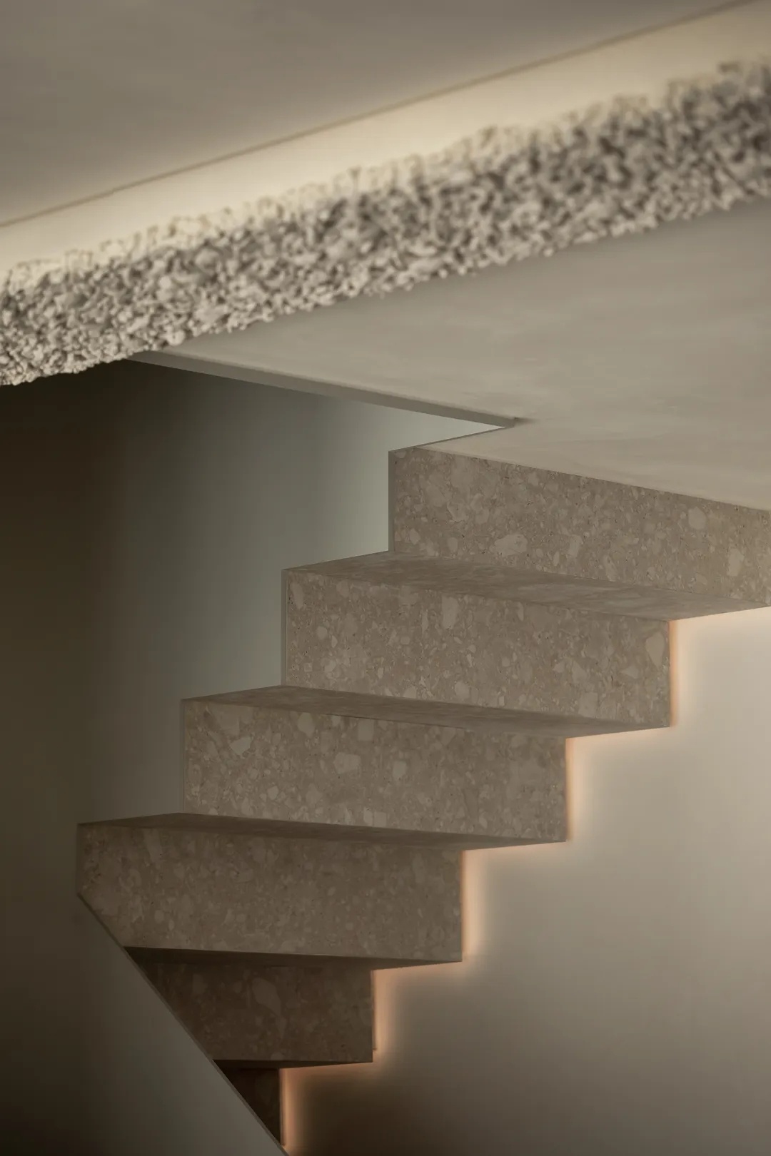 楼梯贯穿上下四层,是家中的核心交通枢纽。为消解户型限制下的狭窄空间体量,设计师从结构与材质出发,以岩板包裹踏步,搭配8毫米厚的钢板扶手,以人行体验为尺度,放大空间效果。而利落的收口,也于细节处展示极简主张,灯光排布至右上与左下的结构缝隙中,营造光线穿过楼层的错觉。