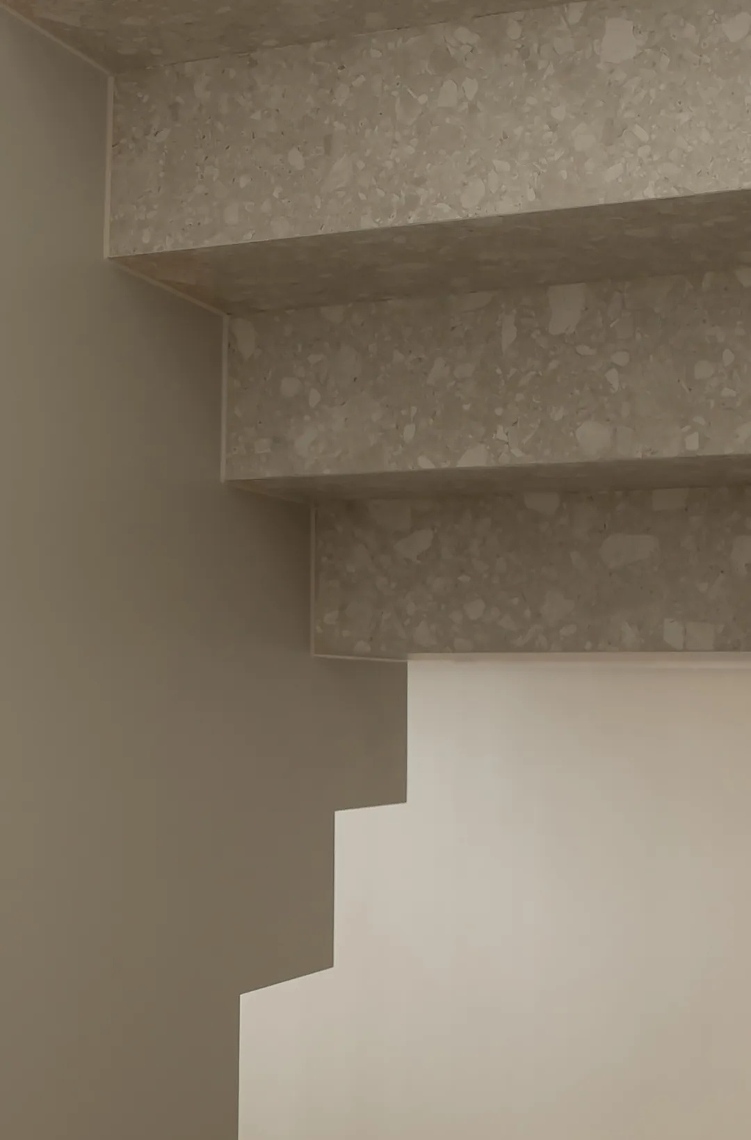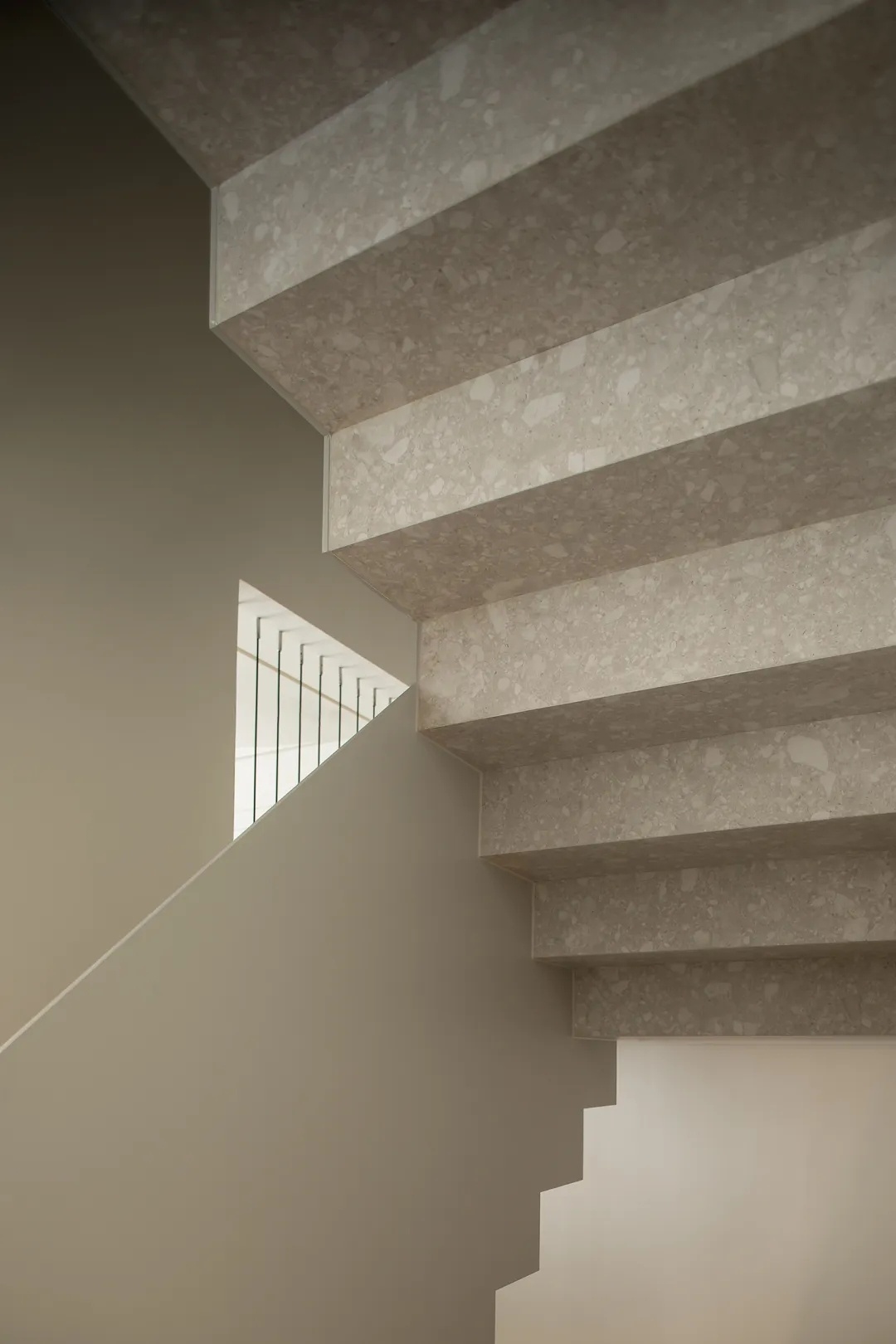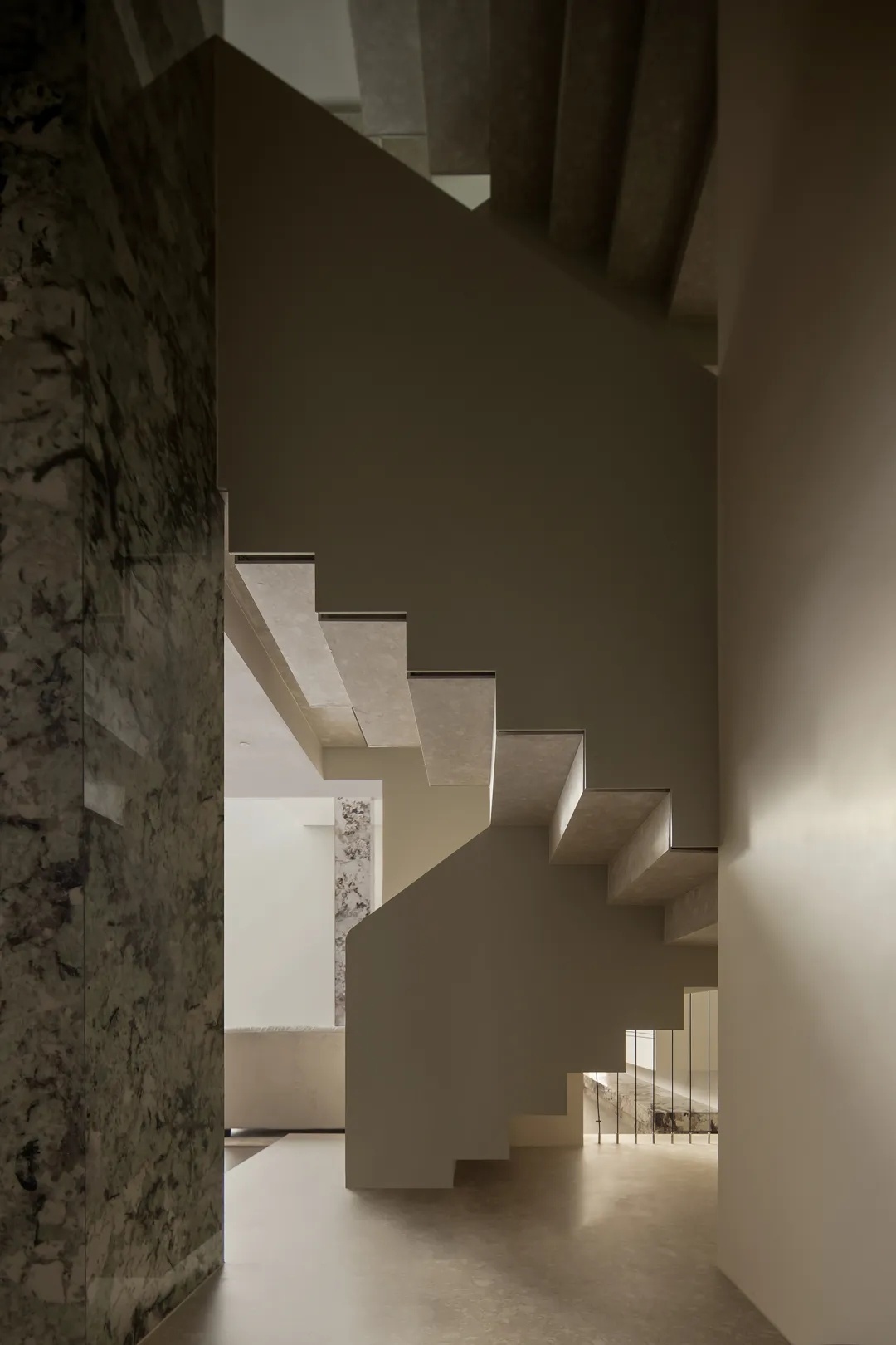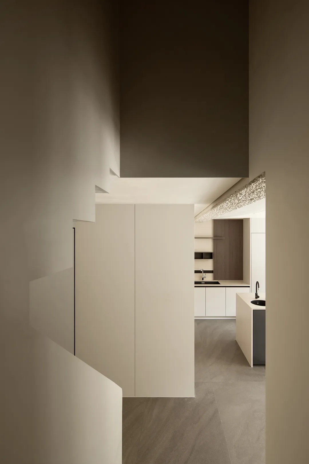 楼梯贯穿上下四层,是家中的核心交通枢纽。为消解户型限制下的狭窄空间体量,设计师从结构与材质出发,以岩板包裹踏步,搭配8毫米厚的钢板扶手,以人行体验为尺度,放大空间效果。而利落的收口,也于细节处展示极简主张,灯光排布至右上与左下的结构缝隙中,营造光线穿过楼层的错觉。