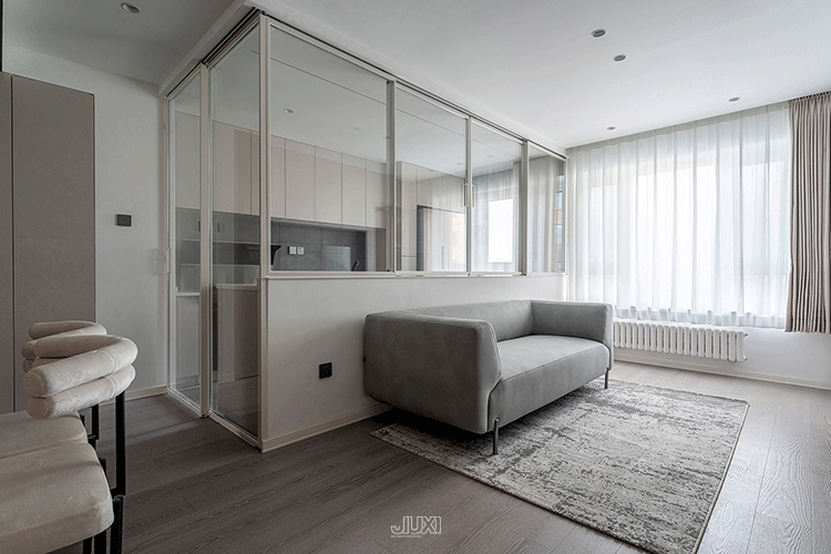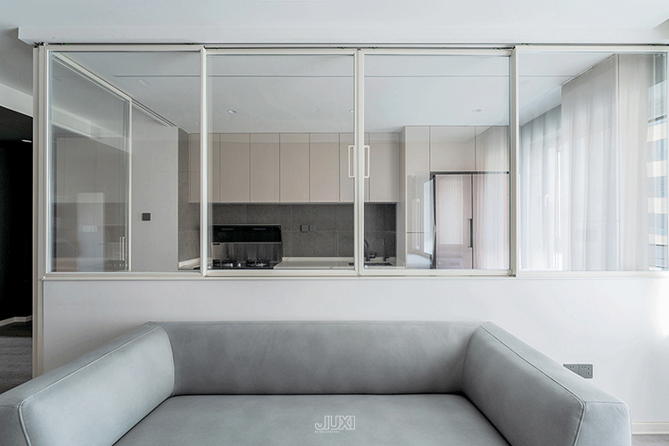 四扇推拉窗组成3.8m的玻璃隔断,让厨房可开可关更加灵动。窗户打开后还能与客厅,实现无障碍交流。
