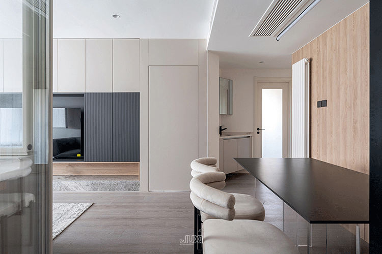 两侧卧室选用无边框无把手的隐形门,与电视收纳墙形成呼应。利落的线条与暖灰色的柜子,增添高级元素。