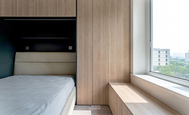 卧室没有单独的收纳墙,利用床头和窗台区域,特别定制了收纳空间。让不大卧室空间,也能拥有充足储物规划。