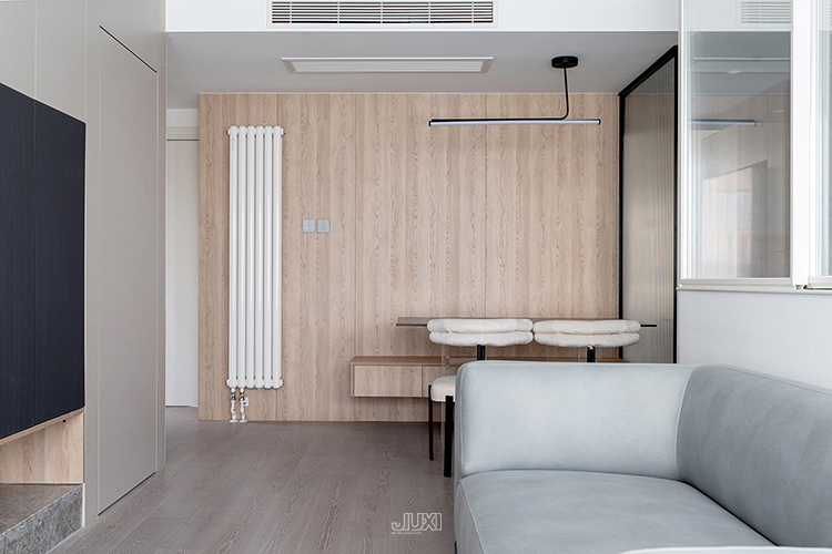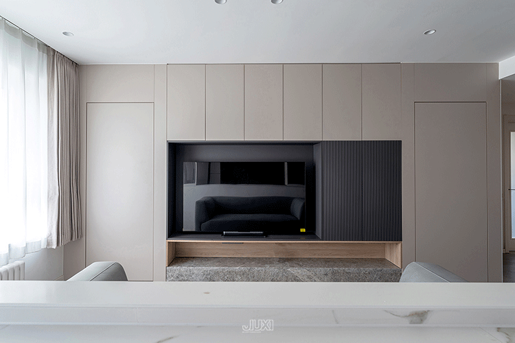 储物电视墙居中布局,两侧是80cm宽的隐形门。暖灰色的柜子中间融入黑色点缀,用来挂放电视。底部石材基底,搭配原木敞开格,营造出一种悬浮轻盈的效果,层次感十足。