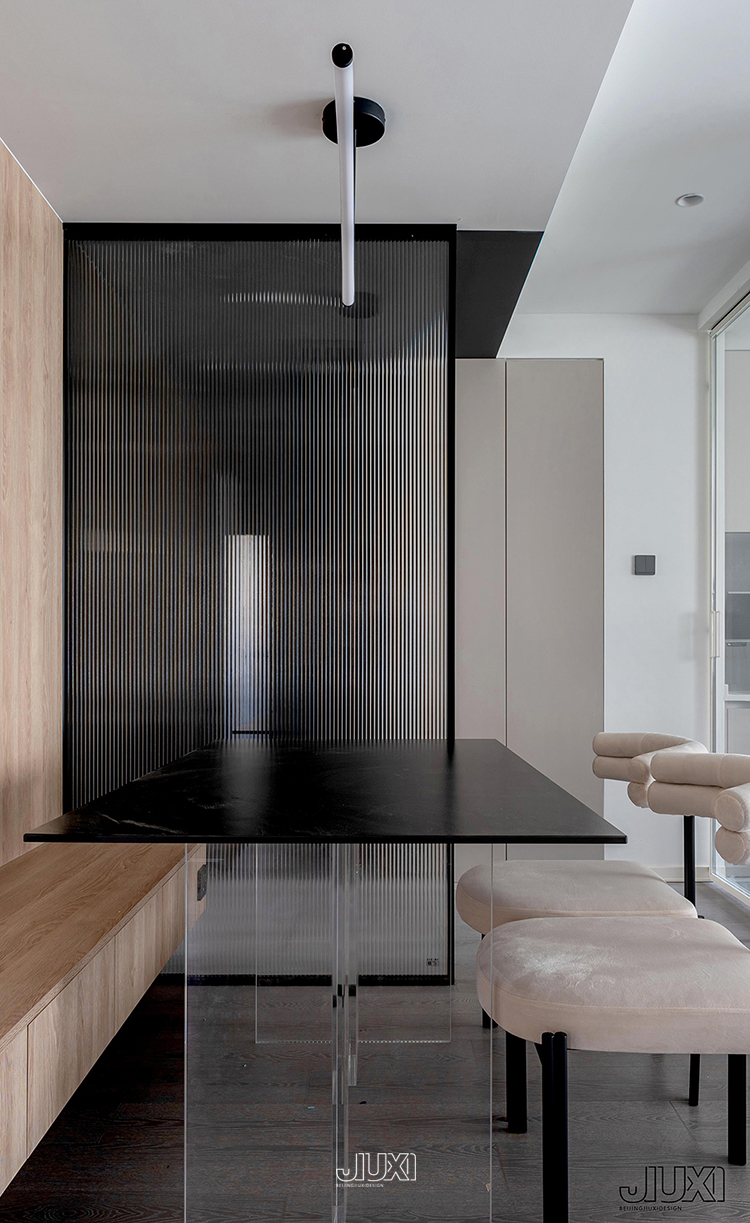 原木背景墙+黑色岩板餐桌+透光的玻璃隔断组成餐厅区,多种元素叠加出来的buff,赋予空间细腻感和高颜值。