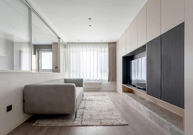 3.客厅将两侧卧室设计成隐形门,与整面储物式电视墙结合,外观拉成一个整齐的平面。