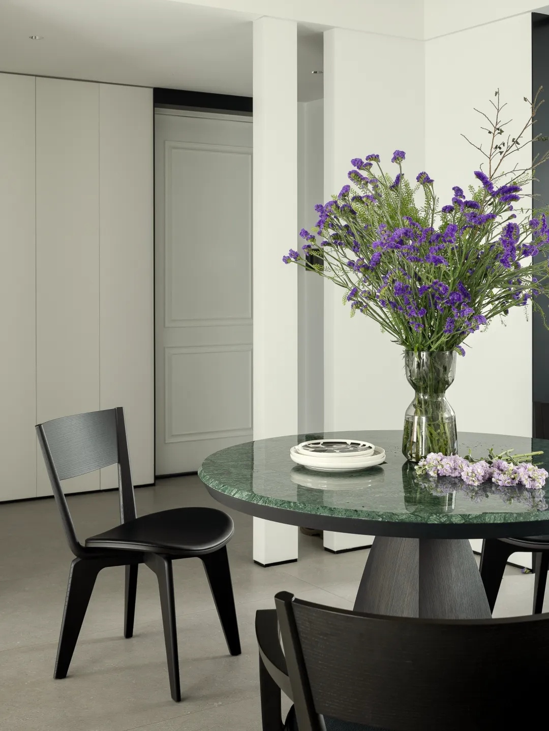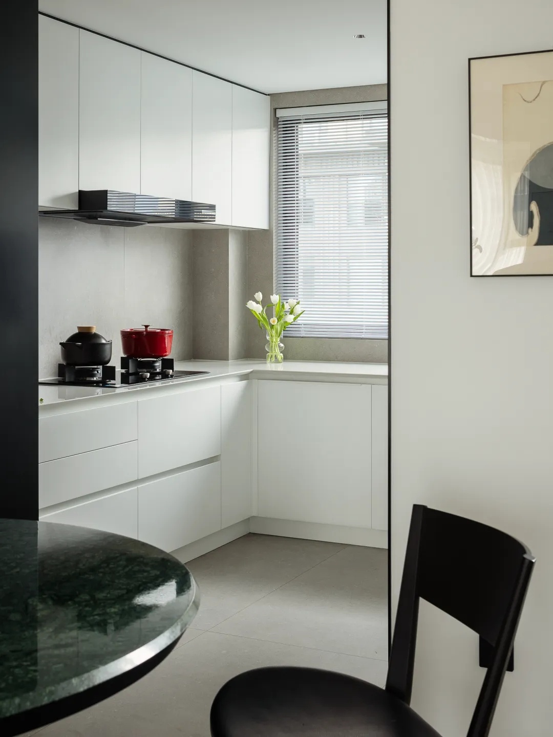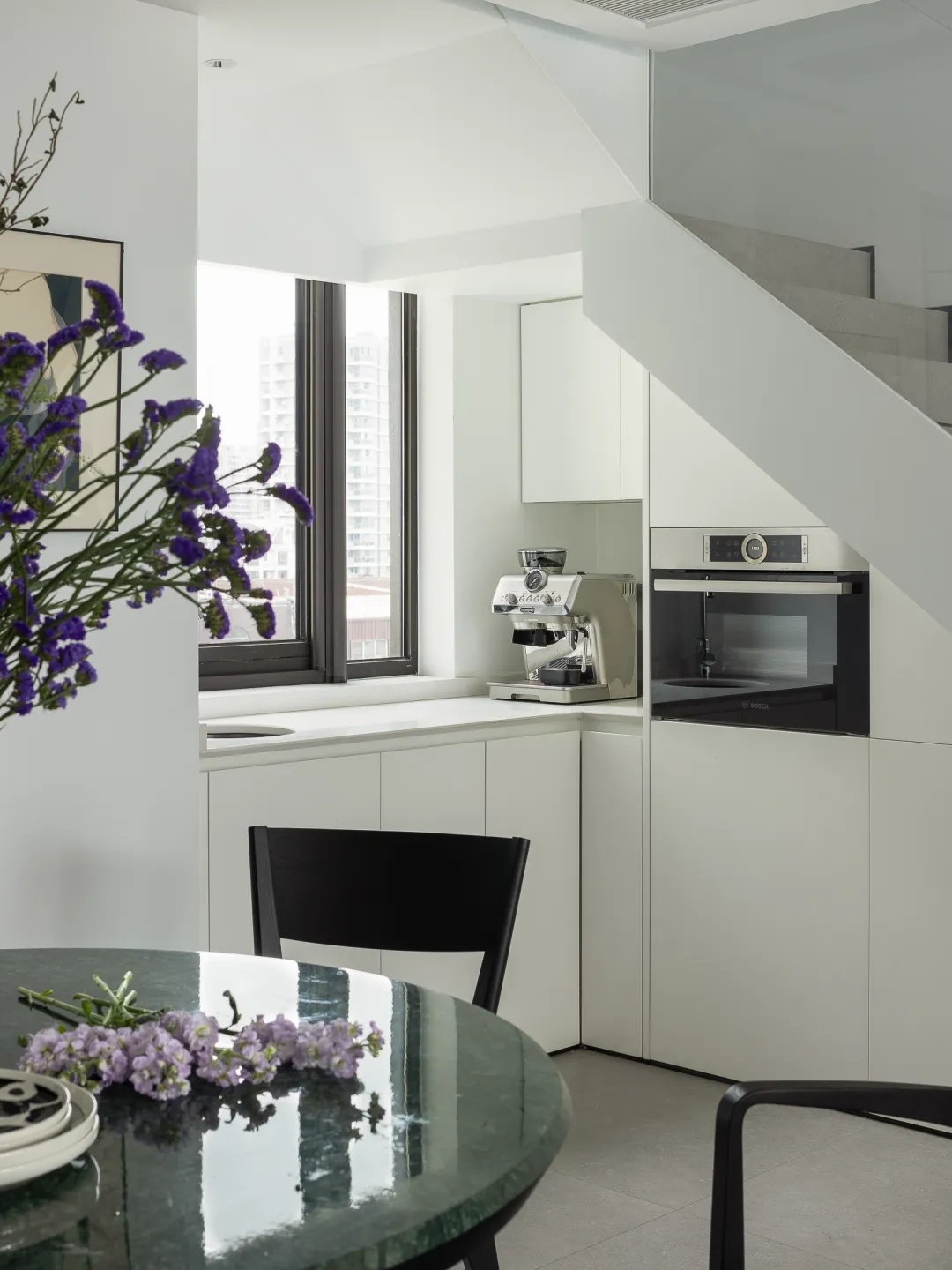 厨房操作台和咖啡角均采用简约的直线条,白色与墨绿色夏荷石餐桌自然纹理交织,呈现出现代与古典的和谐共存。