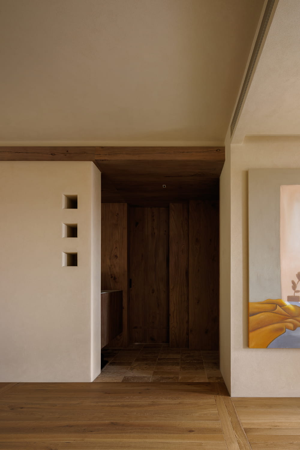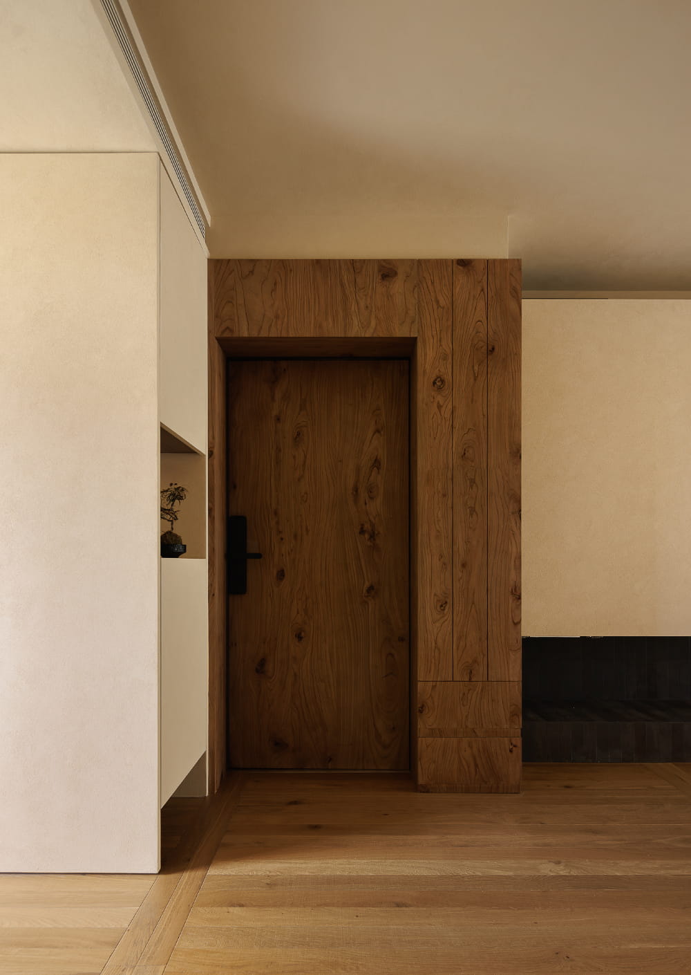 入户门和正对的卫浴区均使用榆木打造饰面,两者在视线上相对,景观也形成了有对称感的呼应。为业主家使用的榆木已有年头,是寻遍市场才找到的,经过时间沉淀的老榆木板子。榆木的选材也寄托着业主对新家的生活期待,两夫妻迎来了新的家庭成员,希望他们在这里开始的生活,能够如我们选择的自然材质一般,在历经时间后更加温润和谐。