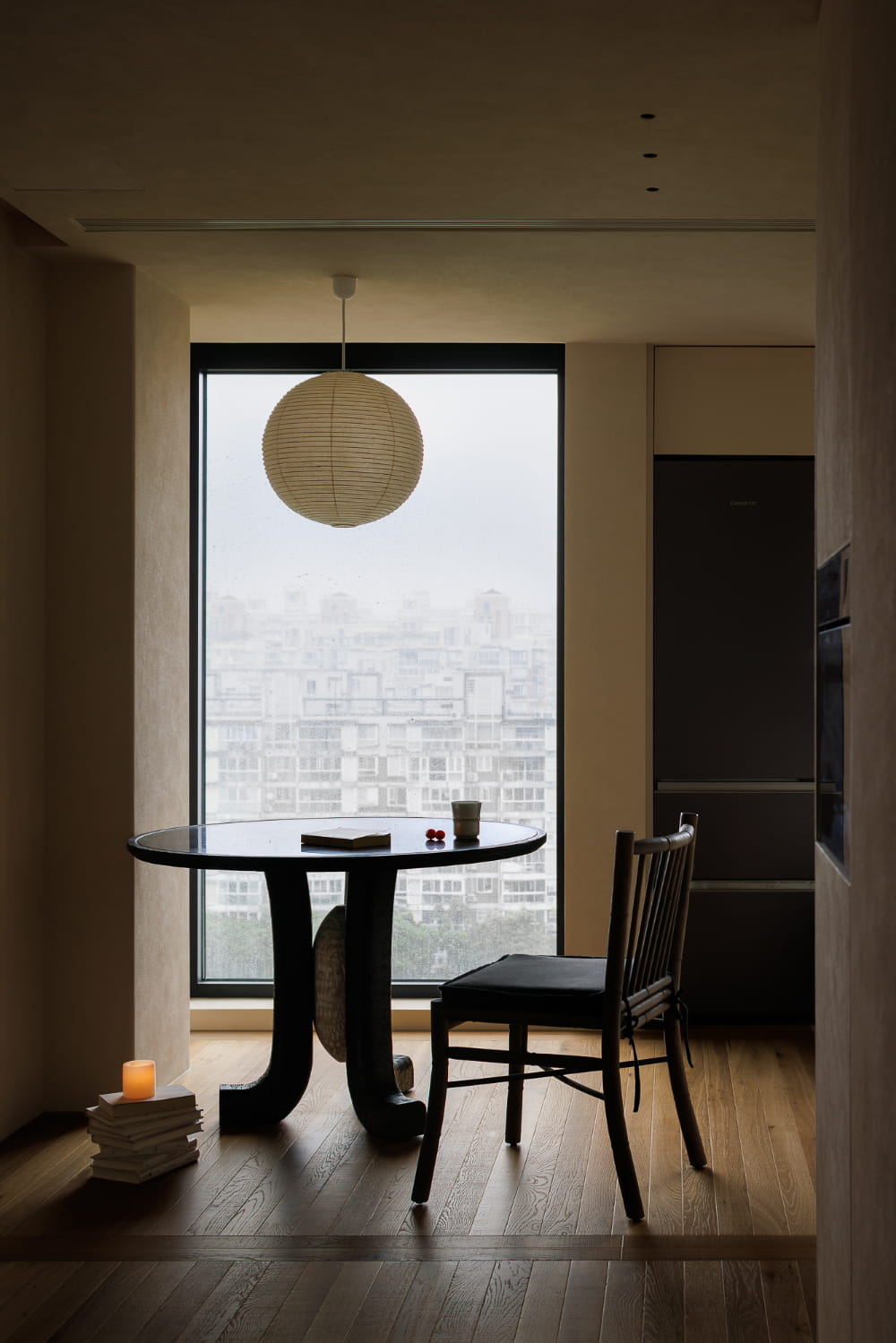 照明方面,客厅打造了极简无主灯方案,光源隐藏于天花板,只留极小的开孔,或藏于沿墙的灯带,若隐若无,辅以餐厅处一盏简约的设计师款吊灯,为温润的空间再填一笔静默的气质。白天,来自客厅与厨房两处窗户的自然光线,没有遮挡地穿过公区,让整体空间更多了通透感。尤其厨房的落地大窗,犹如画框,取景自然,让家有了呼吸感。