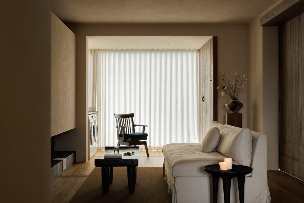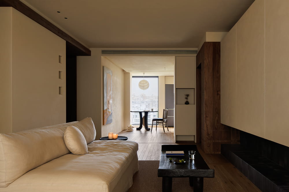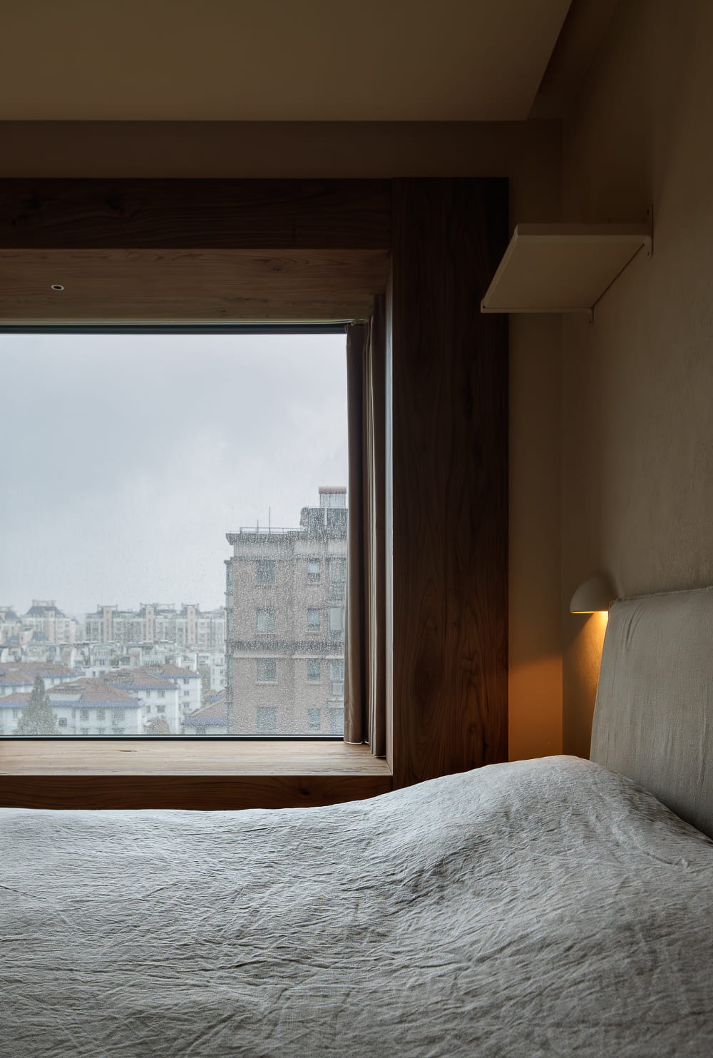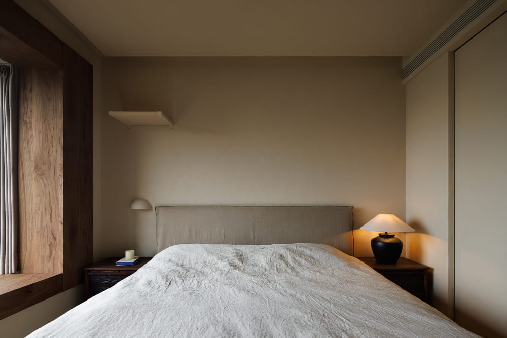 卧室窗户也以老榆木包边,形成一面中式风韵的木质取景框,让窗外本是寻常的楼宇,也成了耐看的风景。空间里,褪去了所有不必要的装饰,以自然肌理还原侘寂风的内敛本质,还原一个让身心全然沉静、被温柔包裹的休息体验。
