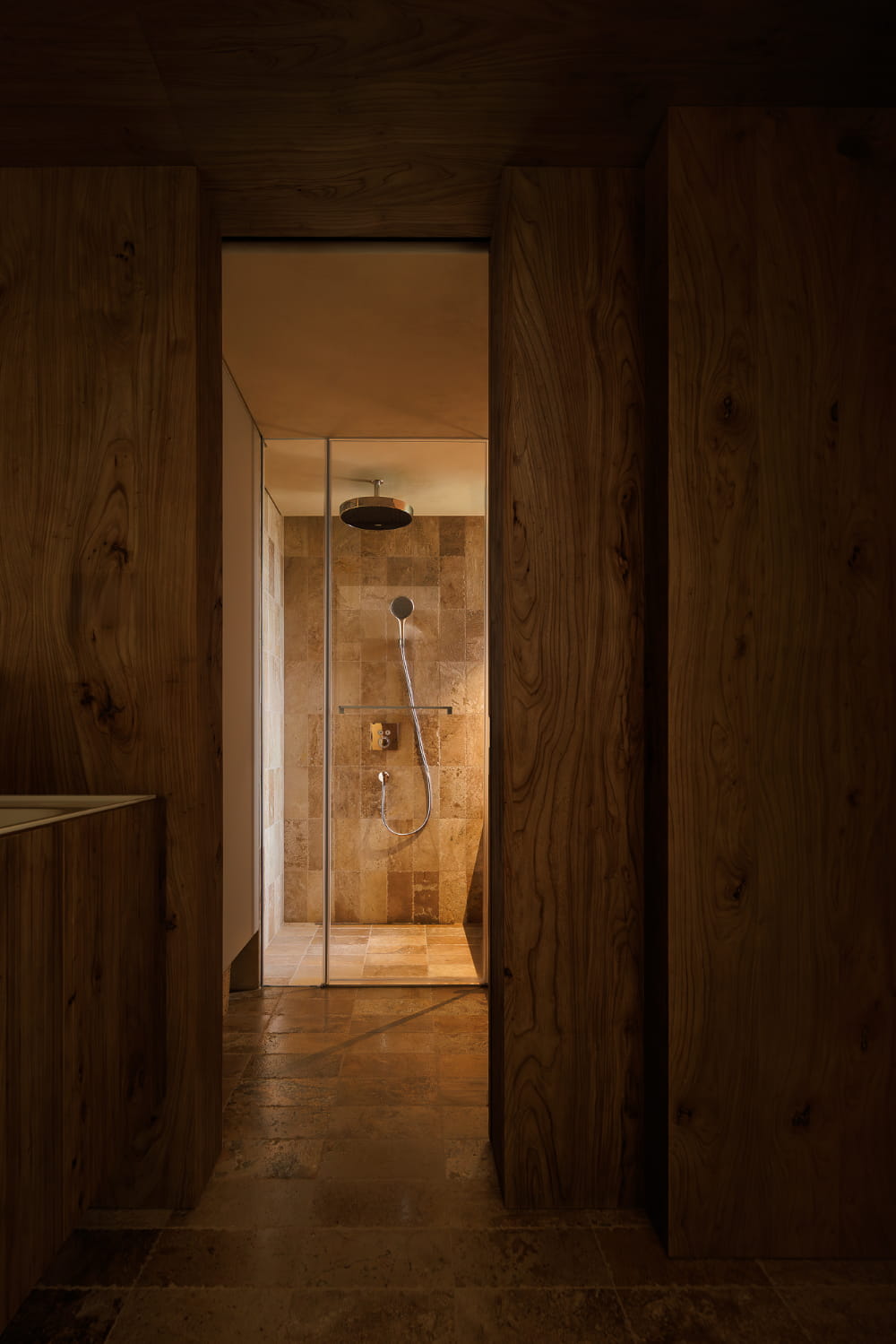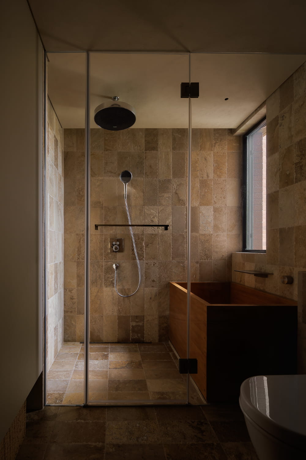 浴室入口,沿用了与主卧相同的厚重榆木移门。这不仅是设计上的呼应,更是体验上的统一——推开它,就切换到休憩模式。设计师致力于把浴室打造成业主卸下疲惫、安放身心的居心地。在这里,满铺的暖调砖石与温润的木质浴缸,围合出一个只属于自己的放松领地,将整日的纷扰关在门外。
