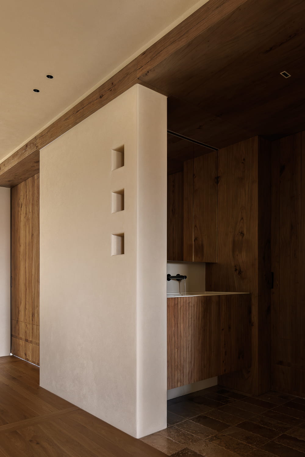 卫浴做了三分离设计,干区外置,方便每个家庭成员的使用。设计师将榆木一以贯之,包裹墙面与顶面。与客厅相隔的墙面设计三个方格小窗洞,为空间注入了建筑感的光线与韵律。地面则铺陈质朴的洞石砖,在材质上巧妙界定出功能区域。