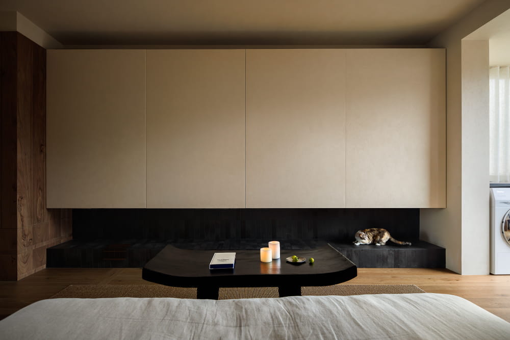 设计师以一道厚重的榆木移门,巧妙界定出主卧的静谧私区。门体与房顶的榆木饰面一气呵成,形成连贯的结构美学,模糊了门与墙的边界。光影随着门片缓缓滑开而流转,温润的木色全然包裹着一方私密天地。推开这扇门本身,就是一种回归宁静的仪式。