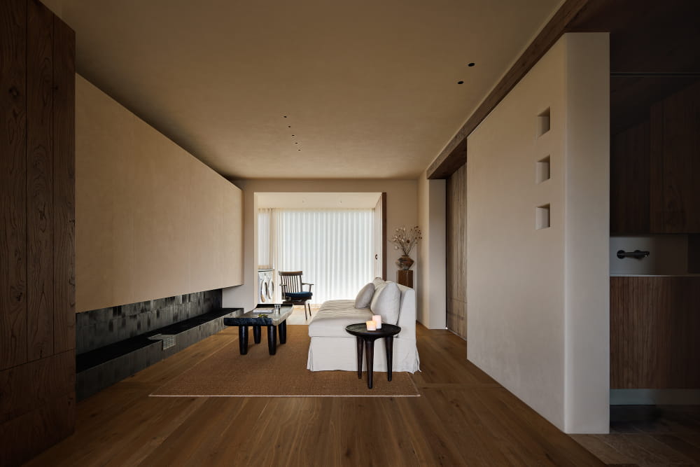 新的家,恰好对应着家庭新的成长阶段,业主希望呈现出温暖而舒适的质感。于是,设计师用了与老榆木同色系的地板铺通客餐厅,为空间奠定了松弛而温和的基调。其次,客厅墙面不做复杂装饰,仅构造一面与墙面融为一体的隐形柜体,以承担储物功能。最后,用肌理感强的榆木作为卧室的移门,同时充当公区与私区的隔墙。通过以上的设计手法,打破了以往侘寂美学给人的距离感,呈现出自然、和谐又克制的美,营造出温和的空间包裹感。