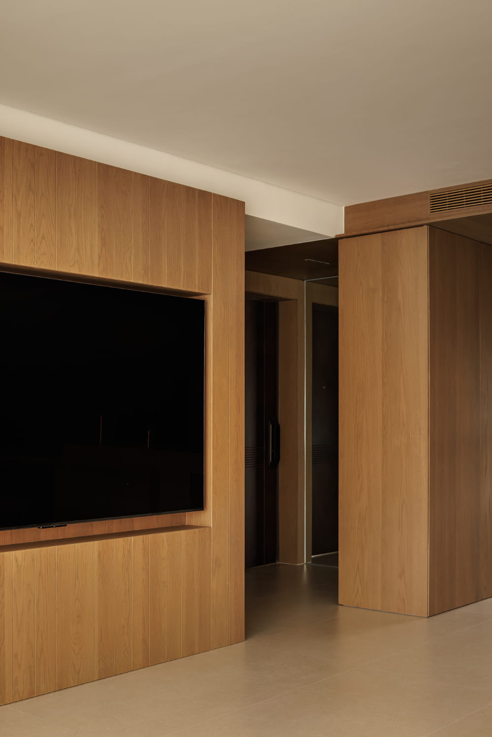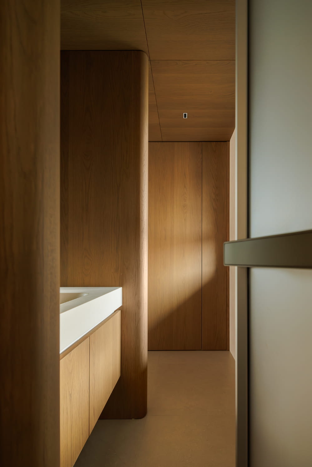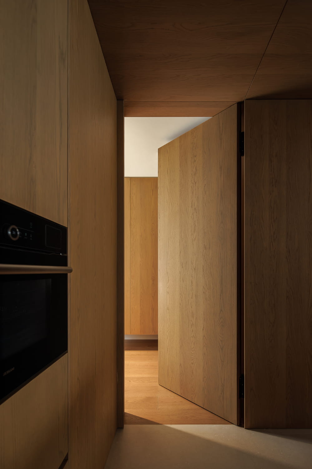 次卧结构在优化拓展之后,门体仍然与餐厨衔接紧密,通过设计手法剥离视觉上的动静关系,隐形门的存在成为通往秘密世界的符号,合上之后,统一材质与极简的线条将背后空间遮掩密实,还给空间视野干脆且隐匿的极简质感。