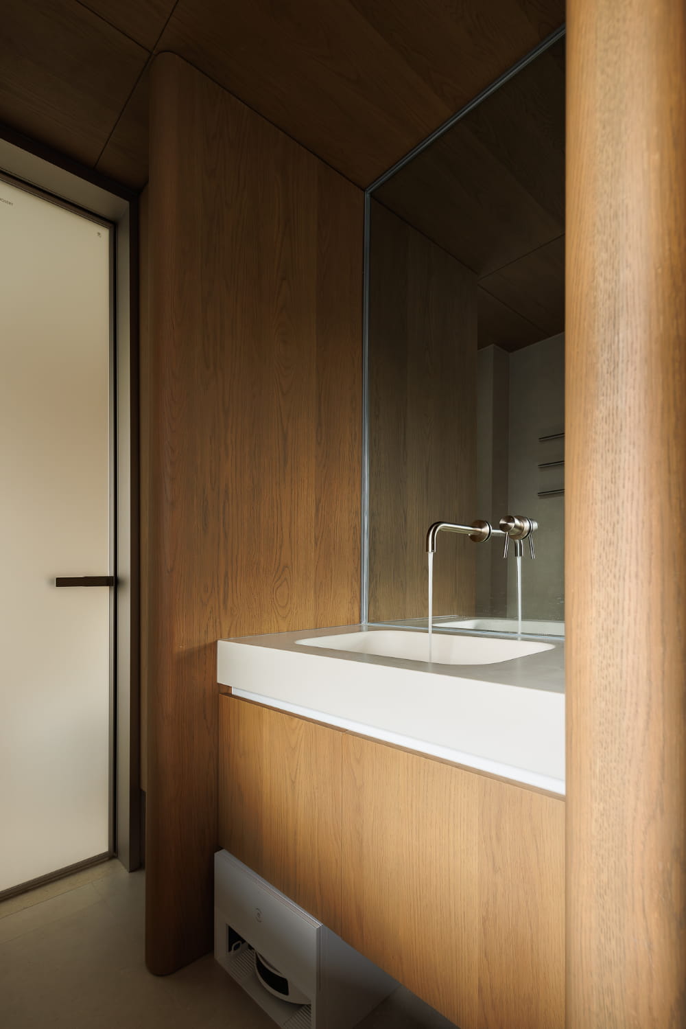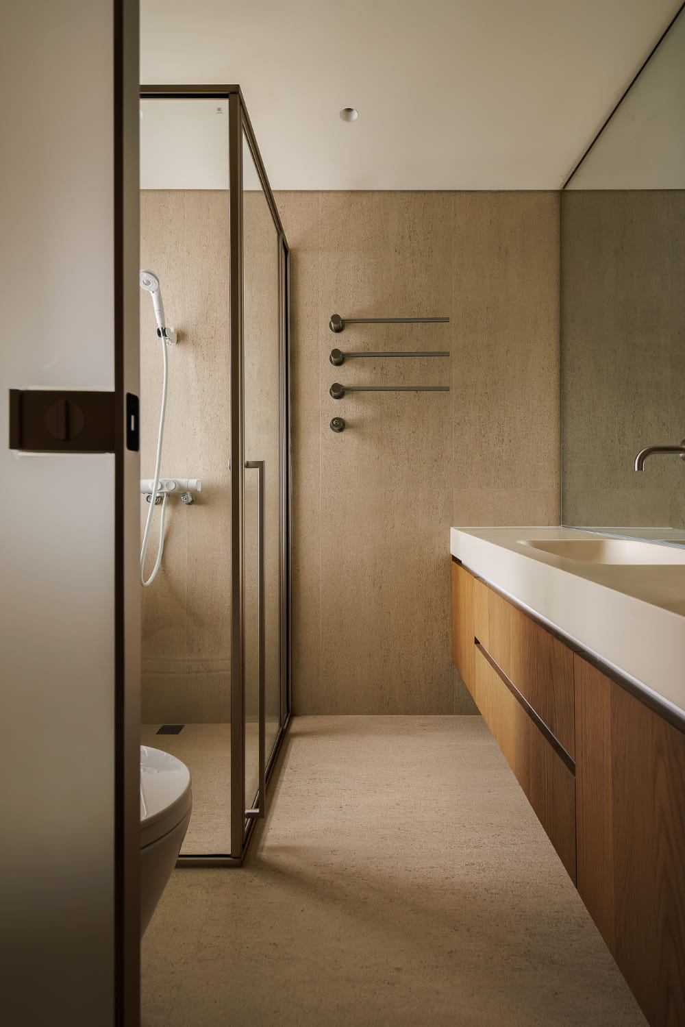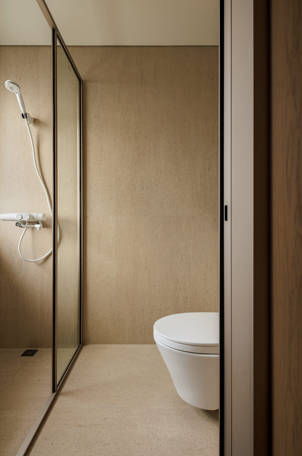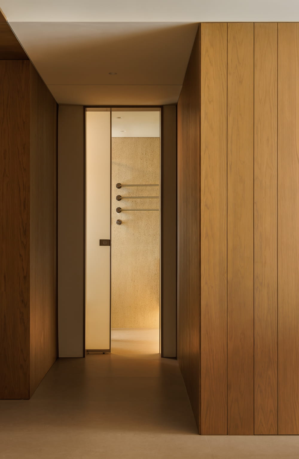 次卧结构在优化拓展之后,门体仍然与餐厨衔接紧密,通过设计手法剥离视觉上的动静关系,隐形门的存在成为通往秘密世界的符号,合上之后,统一材质与极简的线条将背后空间遮掩密实,还给空间视野干脆且隐匿的极简质感。