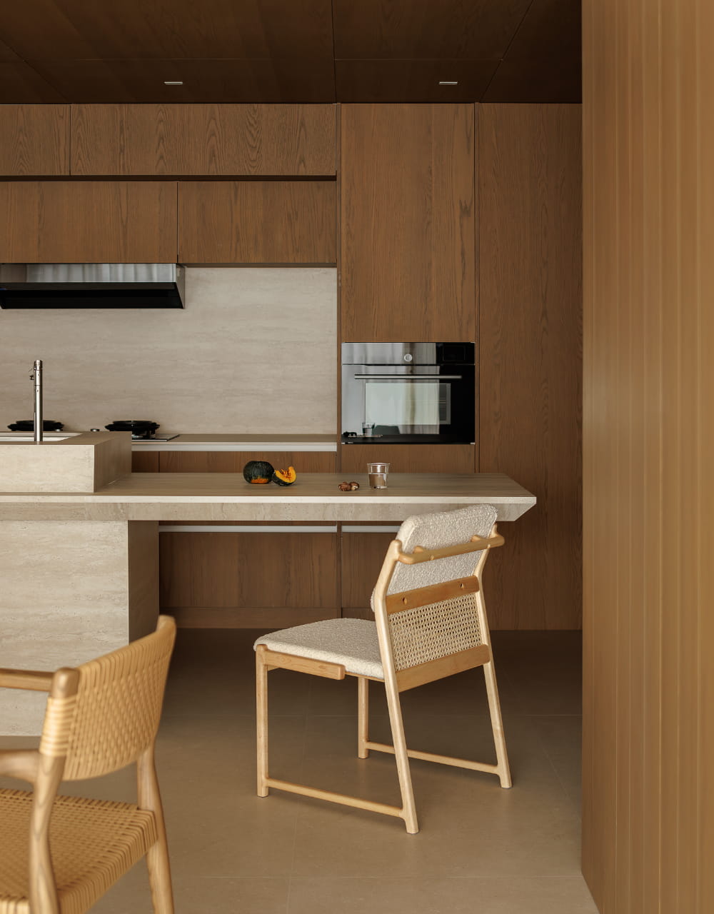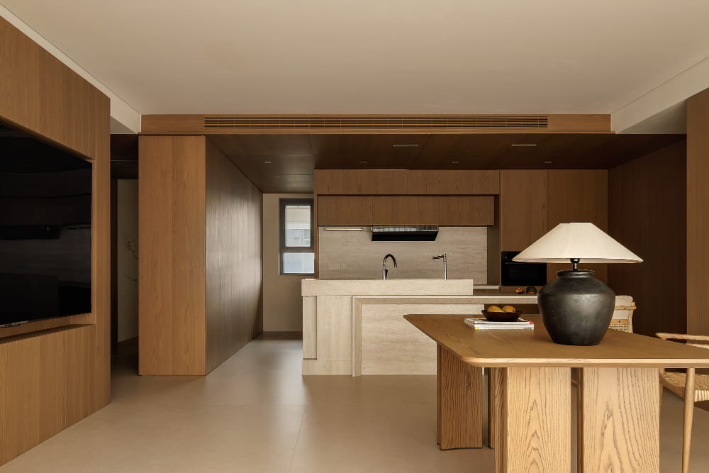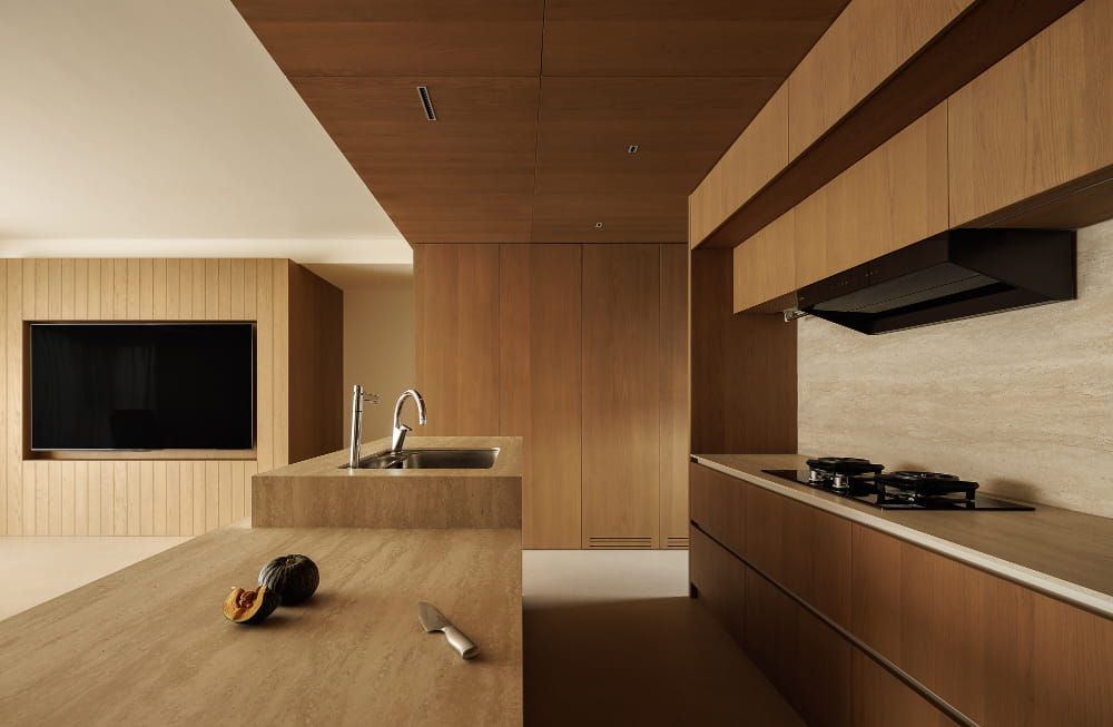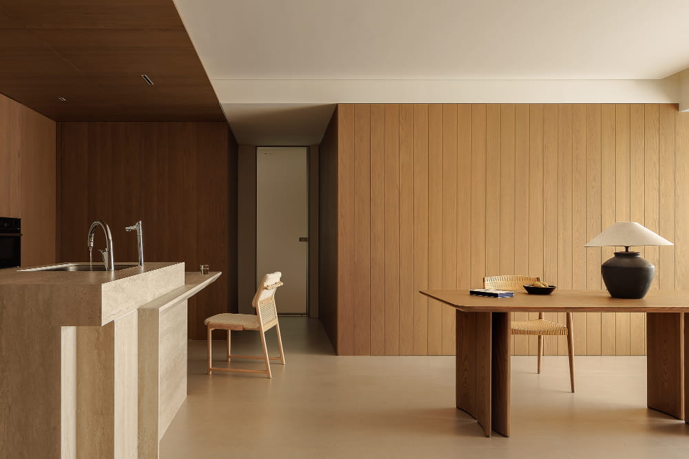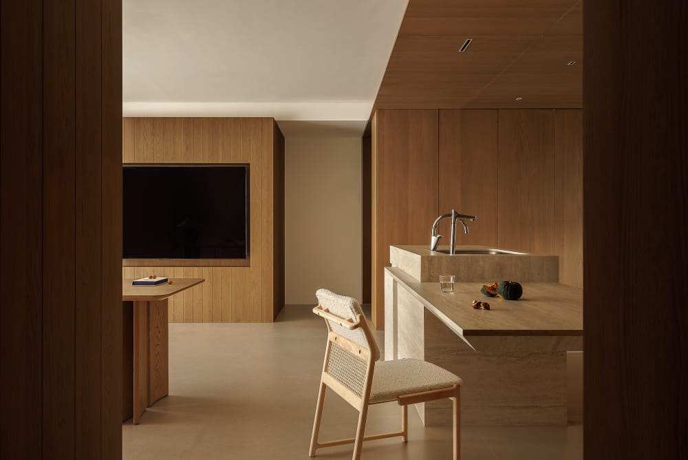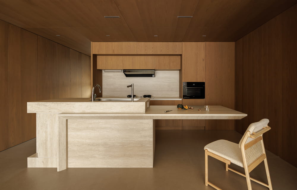 对于空间的呈现而言,放量尺度的方式更能收获理想的效果。质朴材质的全方位包裹,将餐厨部分进行刻画,强调其独立划分的区域性,在空间视野的通达上也拥有足够的开阔感。界限既有且无,赋予空间理性又肆意的气质。
