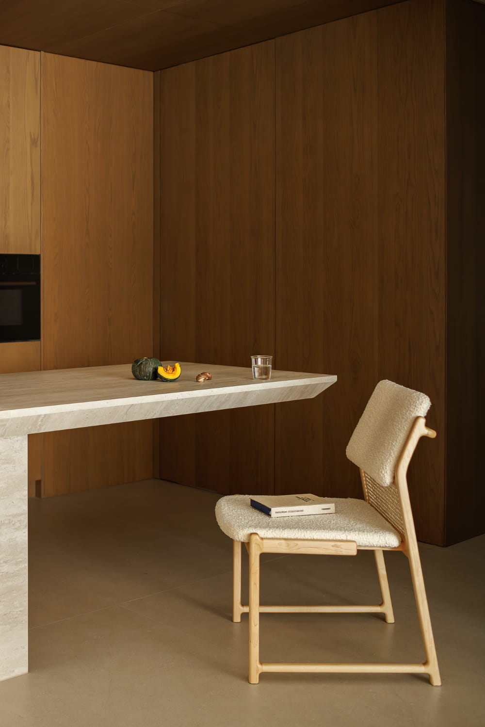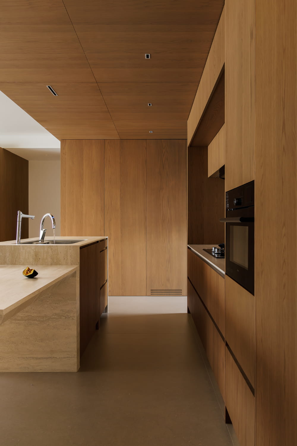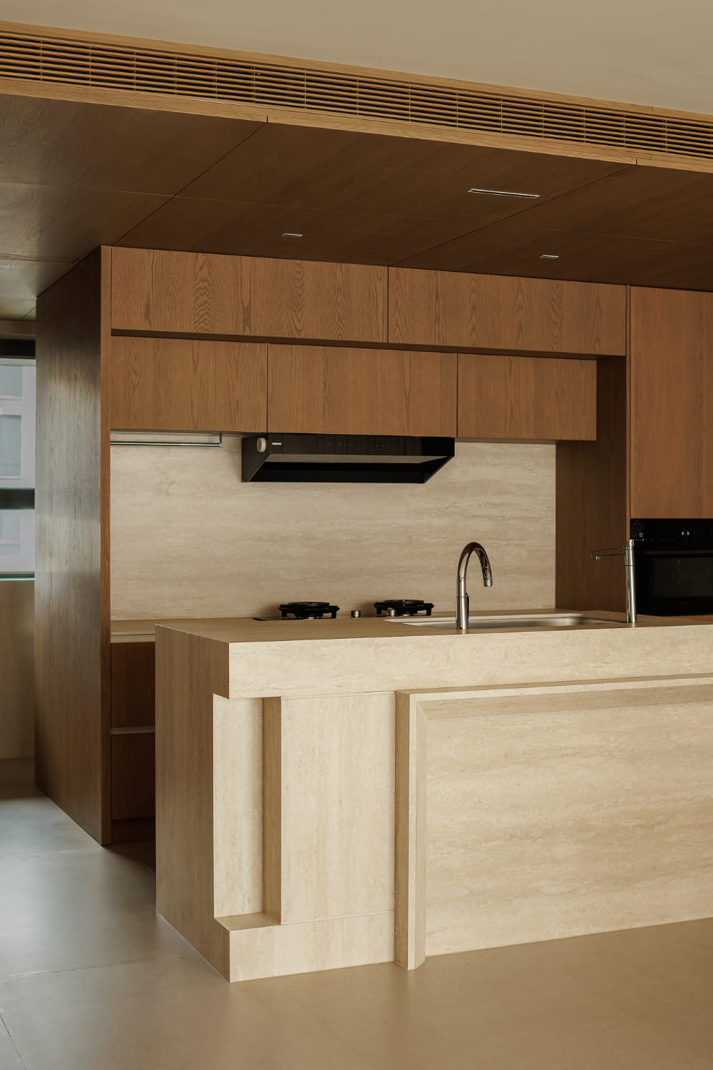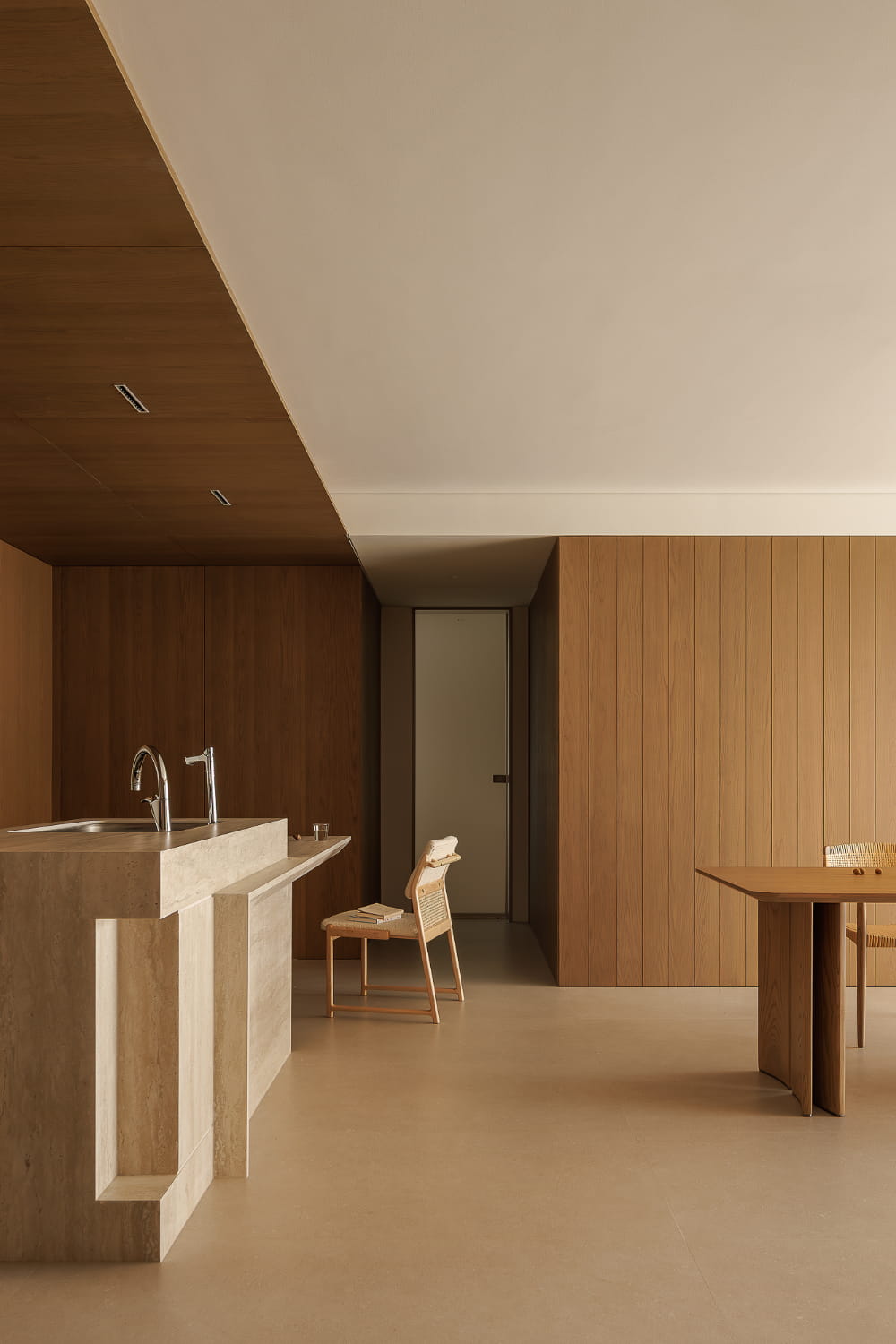对于空间的呈现而言,放量尺度的方式更能收获理想的效果。质朴材质的全方位包裹,将餐厨部分进行刻画,强调其独立划分的区域性,在空间视野的通达上也拥有足够的开阔感。界限既有且无,赋予空间理性又肆意的气质。