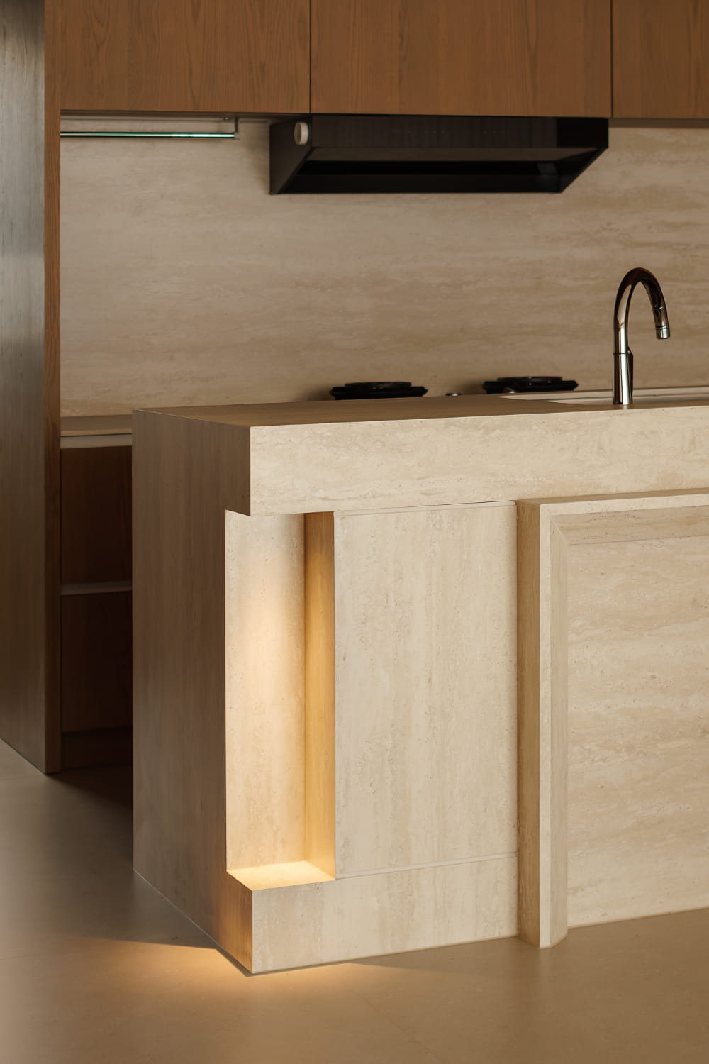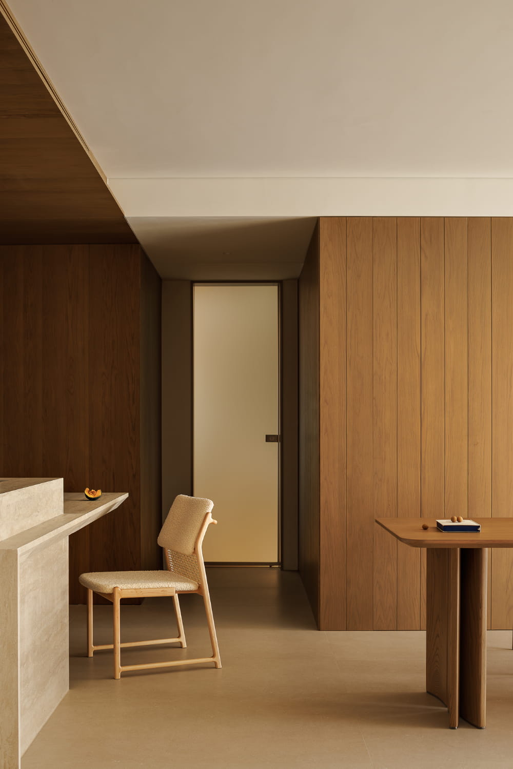 用餐区域的重心自然是餐桌与岛台组合一体的大尺寸功能台,选择以自然洞石材质呈现,单边悬浮结构释放轻盈感。同色系柜面与顶面接轨,立体维度上的统一呈现干净从容的质感,让温和清简的空间表达融入日常三餐的氛围之中。