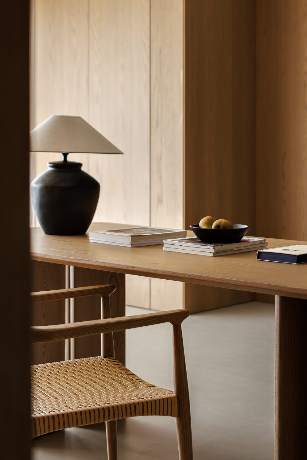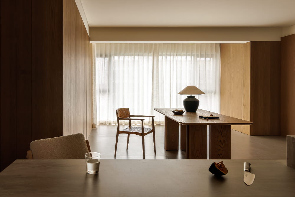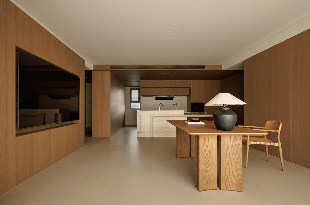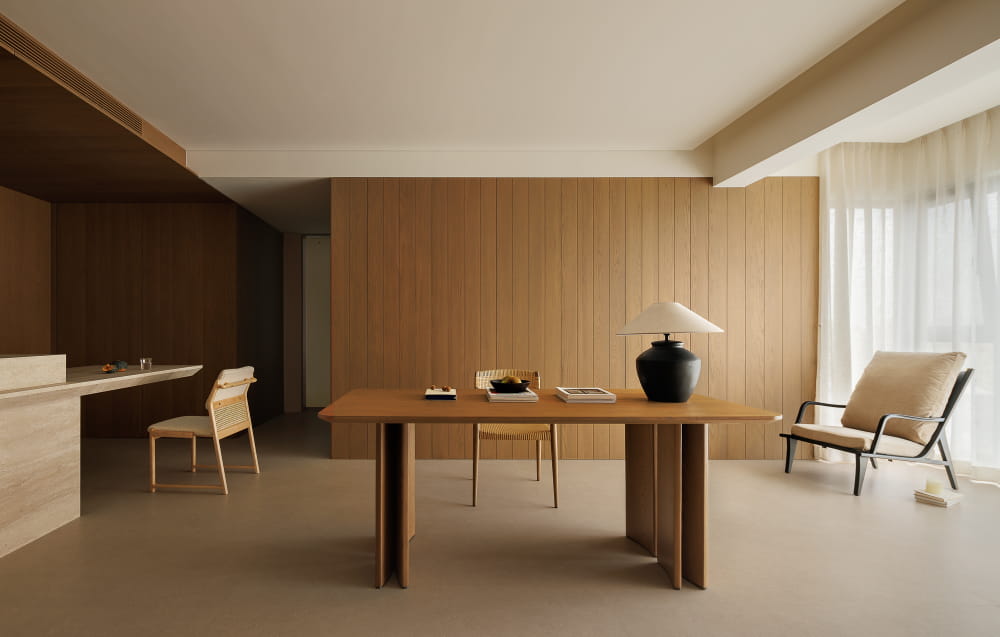 打破常规结构的客厅,是更为契合居者家人的布局。长桌代替沙发,于单调的会客起居室增添品茶、阅读、办公等多重功能。设计回归到本质而言,即以人为本,度身定制,以设计贴合细节习惯,辅以舒适、轻便的日常生活。
