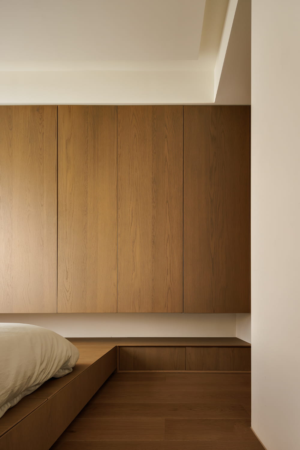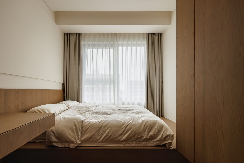 晨光与月落会在昼夜交替时间流转之间轮换着拥抱这方空间。温和的木质与柔白的底色,共同轻声诉说着私密空间的舒缓与治愈。全屋铺设地台的设计,从功能到心灵上释放规则与束缚,让睡眠氛围更加自由。