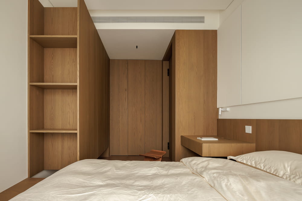 次卧结构的优化在于,拓宽空间增设衣帽区域,组合型柜体的搭建充分满足居者的收纳需求。延续全屋的自然材质,将其温和清简的气质一同引入这方空间,在日升夜幕里,静谧安然的氛围自然氤氲而出,丰盈着最为私人的精神自留地。