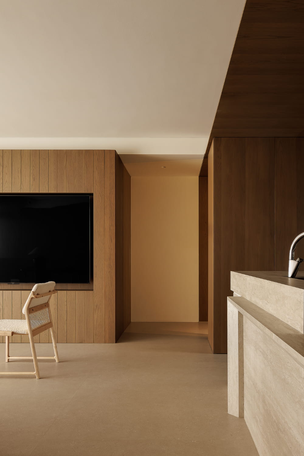 在空间的材质选择上更注重统一性,通过大面积的木元素,呈现极简而温和的效果。微水泥作为地面通铺材料,其独有的整体性强调空间的完整感,让视觉延伸更为自如。家具上的精简,辅以恰当的灯光组合,共同描摹出简约而不空洞的宜居之家。