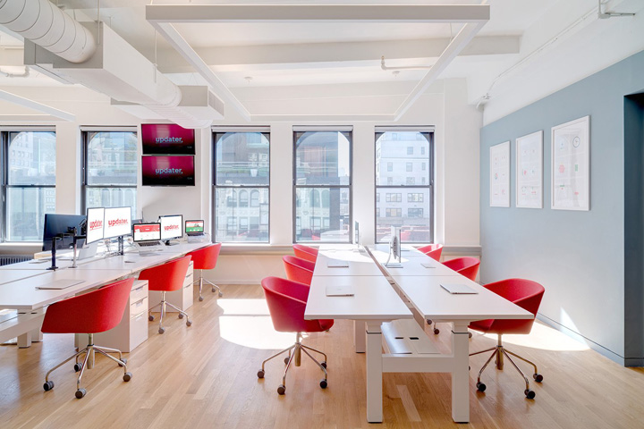 设计说明:开放明亮、时尚简约、火焰般的红色在室内轻舞飞扬,令整个空间焕发着甜美纯净的青春朝气。这就是科技公司Updater位于美国纽约的新办公室,由TPG Architecture团队设计。时尚办公网曾分享TPG团队的许多办公空间设计作品。