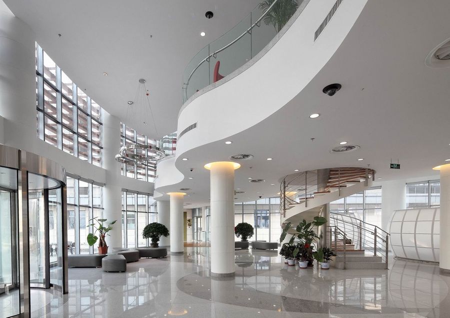 设计说明:本案位于天津武清开发区的天狮国际健康产业园,建筑面积8800平方米,是以生命医学保健品的研制开发、质量检测为主要功能的综合办公楼。整个建筑分为研发中心(三层)、质检中心(五层)、多功能厅三部分,研发中心和质检中心通过椭圆形的大堂连接。