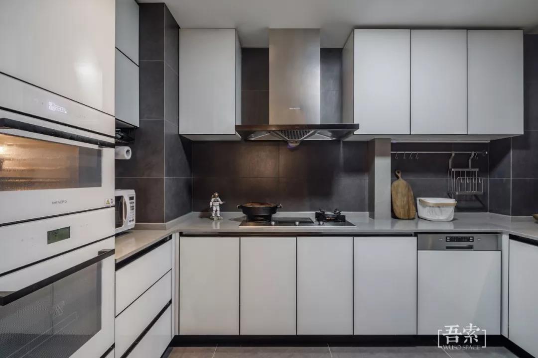 干区与洗衣机之间空出的距离自然的形成了一个尺度舒适的活动区域,在这里我们产生每天最频繁的生活行为,换洗的衣物能够很顺手的洗烘,整面的过道墙用一副装饰画让这里成为客餐厅另一个空间的延展。