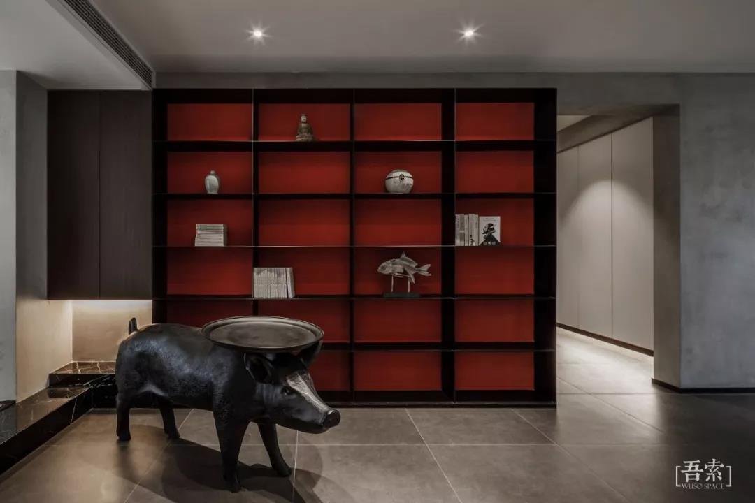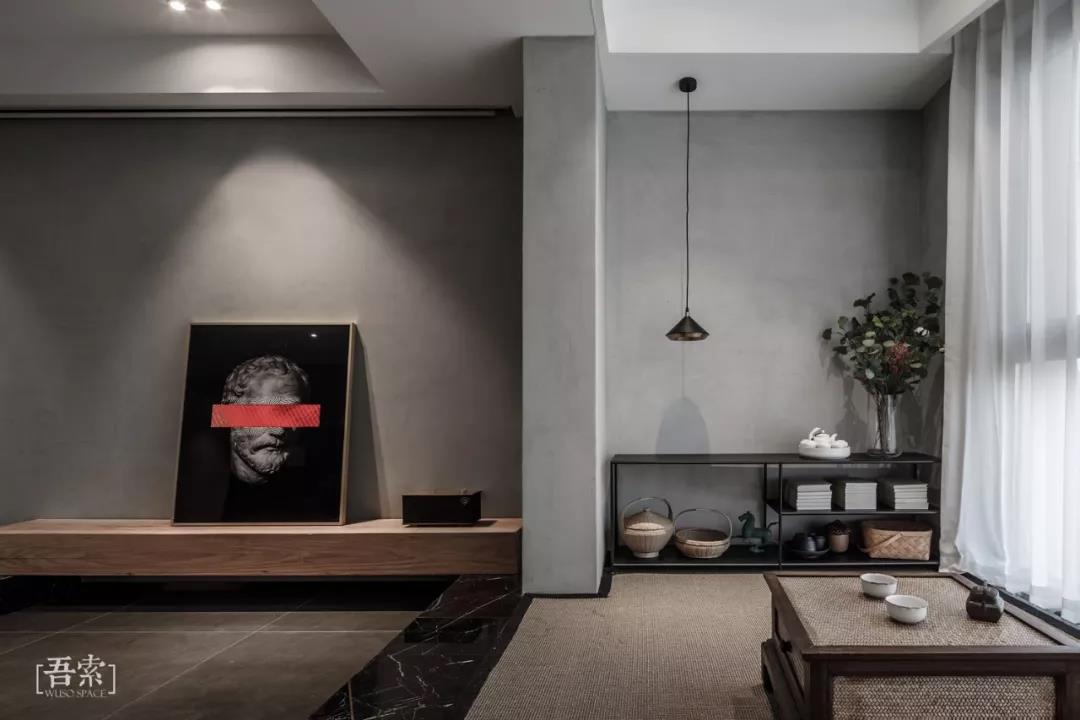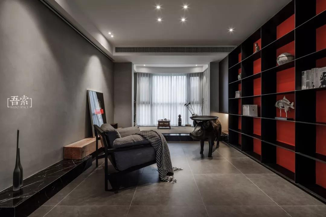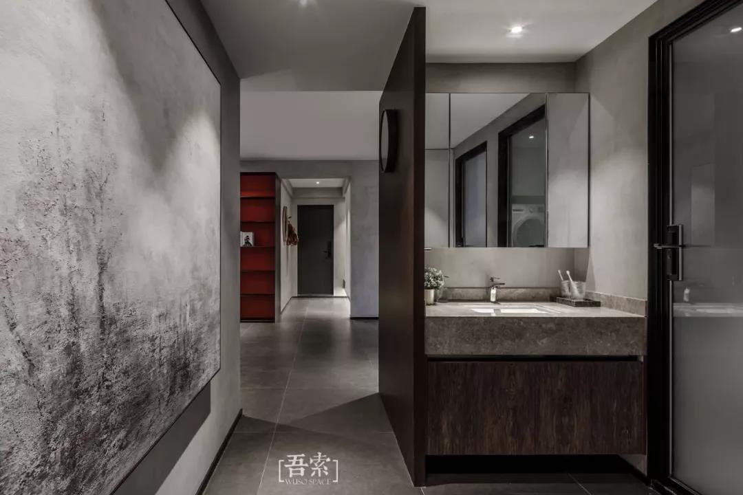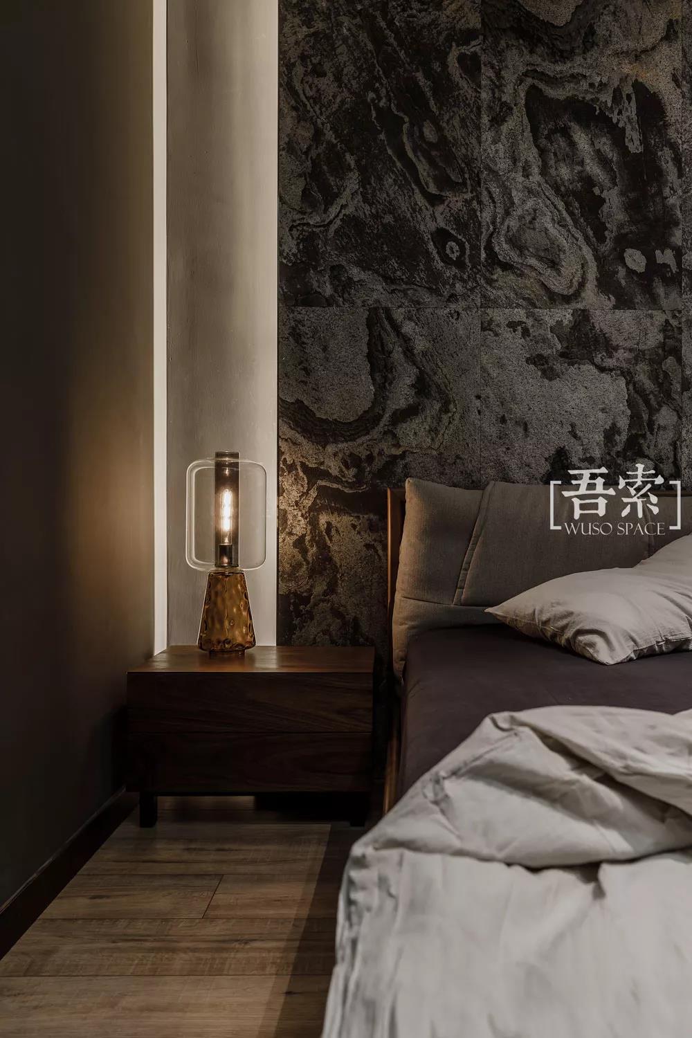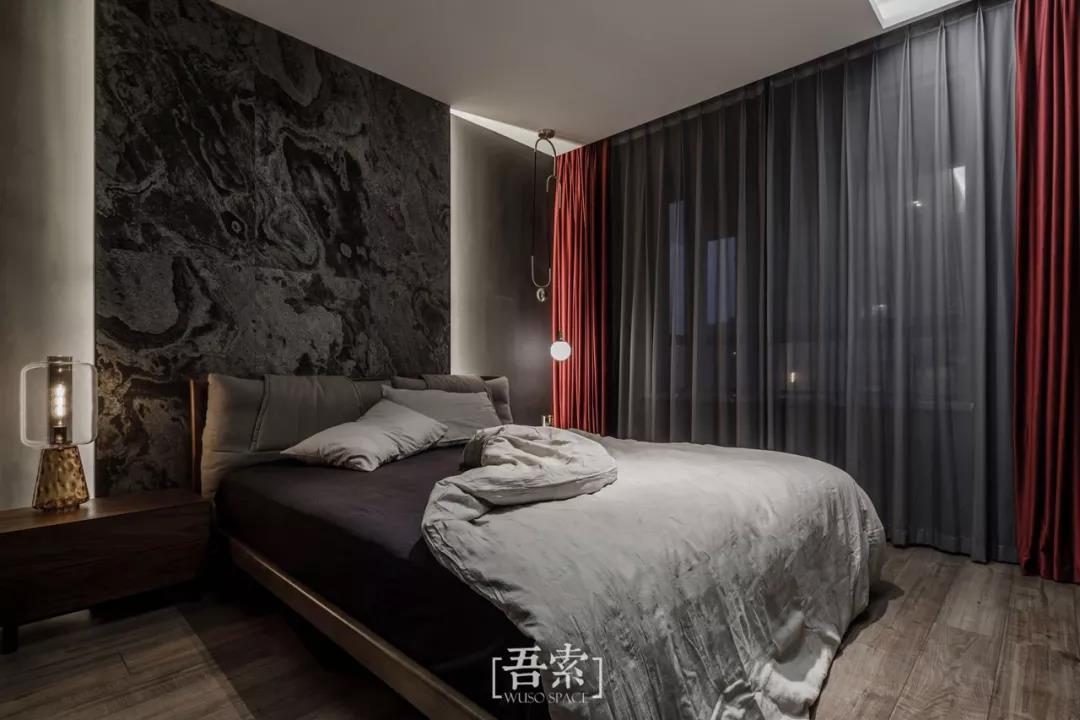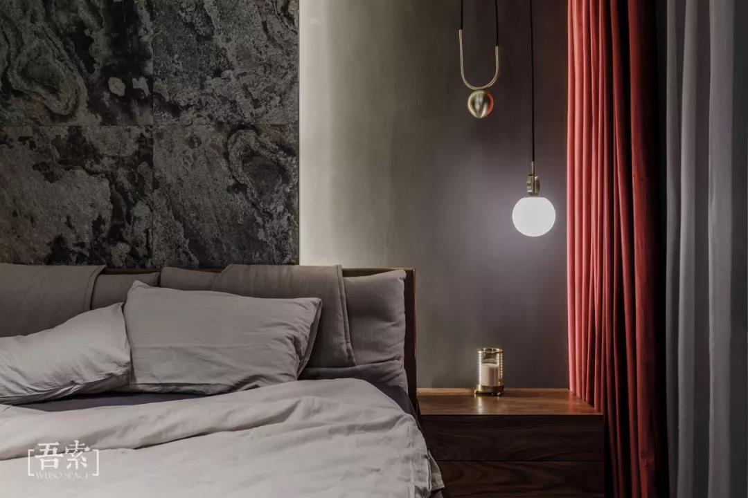 这是林语堂的一段话,生活中除了柴米油盐,自然与艺术同样不可或缺,床头背景采用的是天然薄石材,每一片肌理都是自然与艺术最美好的结合,暗色调的整体风格以及红色窗帘的点缀都能体现出空间的质感。