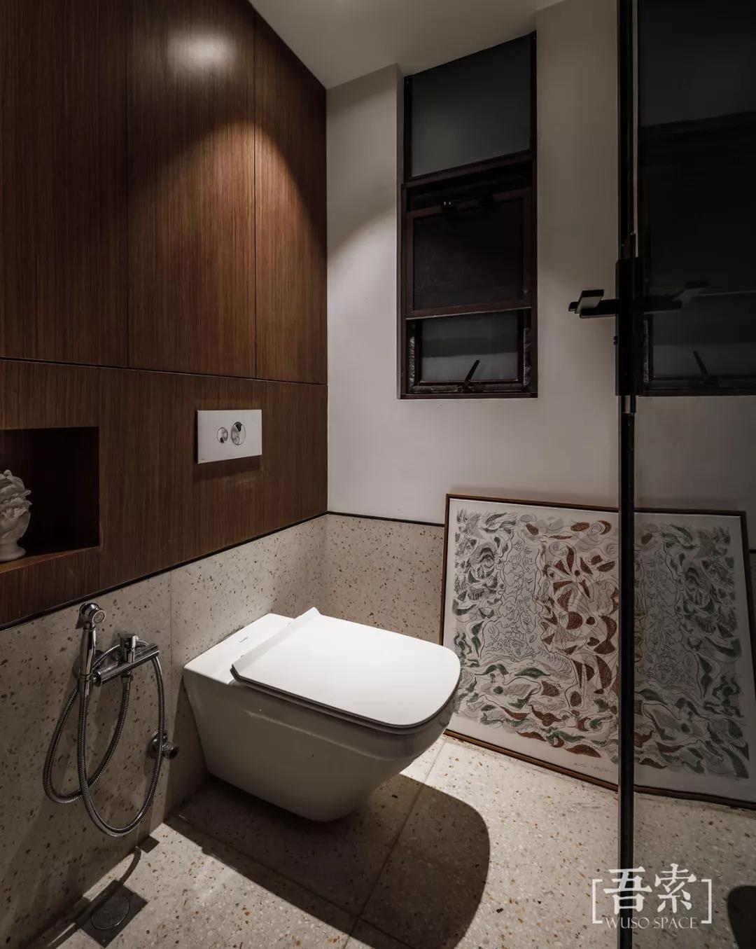 独立的马桶间基本不会有很多水,材质上也只是将地面的水磨石上翻了一块砖的高度,利用壁挂马桶墙体的厚度自然的做成了一个柜子,让收纳清晰独立。