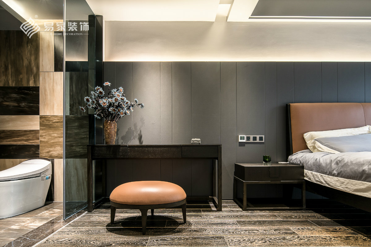 主卧室与卫生间采用开放式设计,空间敞亮通透,给生活增添一分情趣。