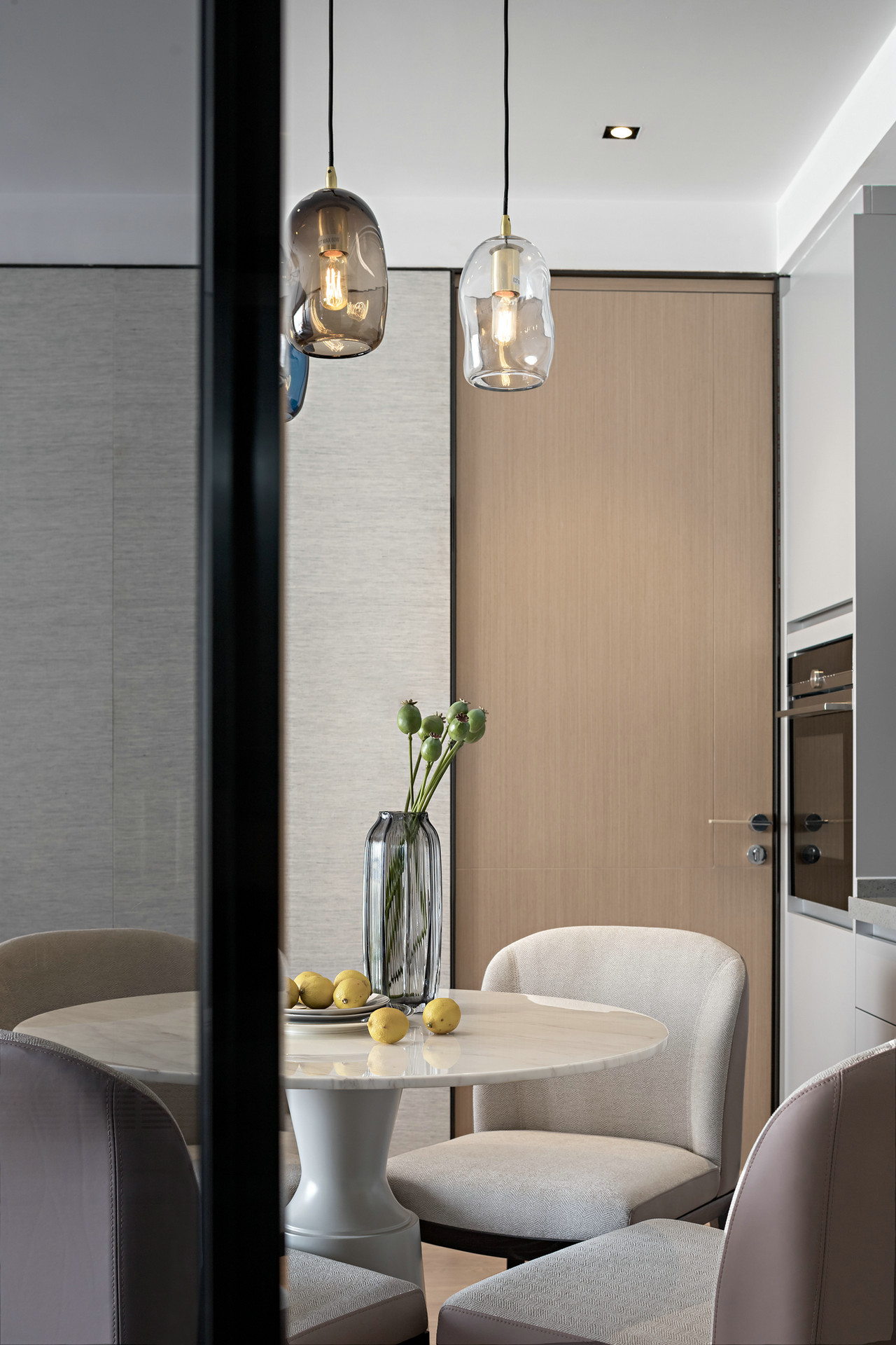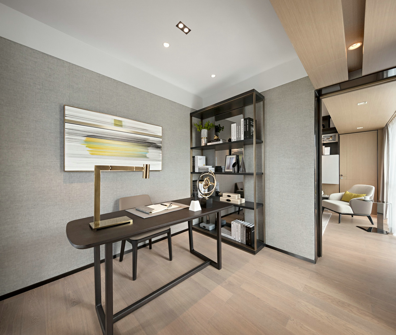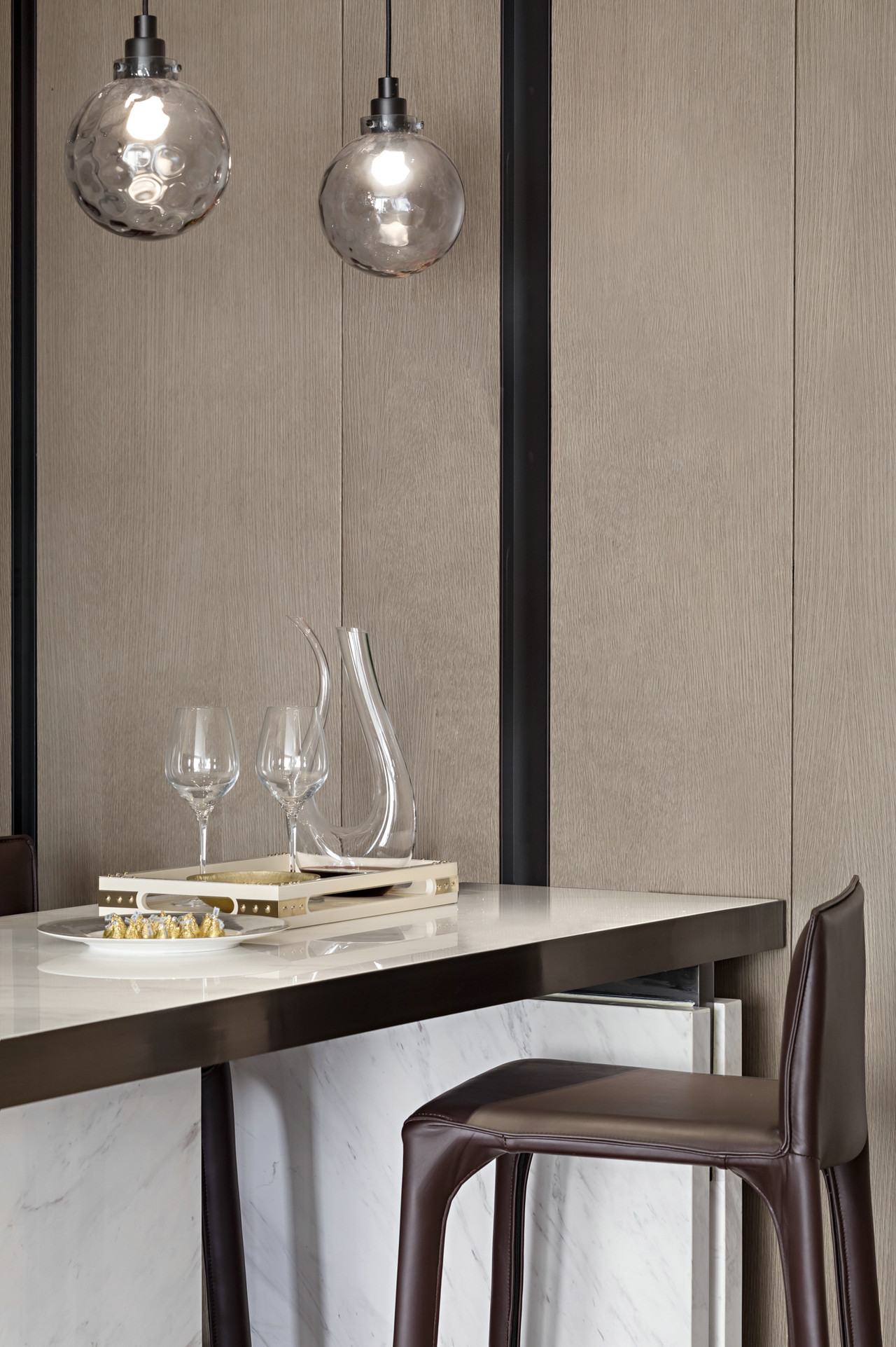 Minotti家具奠定整体空间的基调,将“国际范”融入到了整个空间,金属、玻璃质饰品的点缀又将客人拉回到“生活”中来。