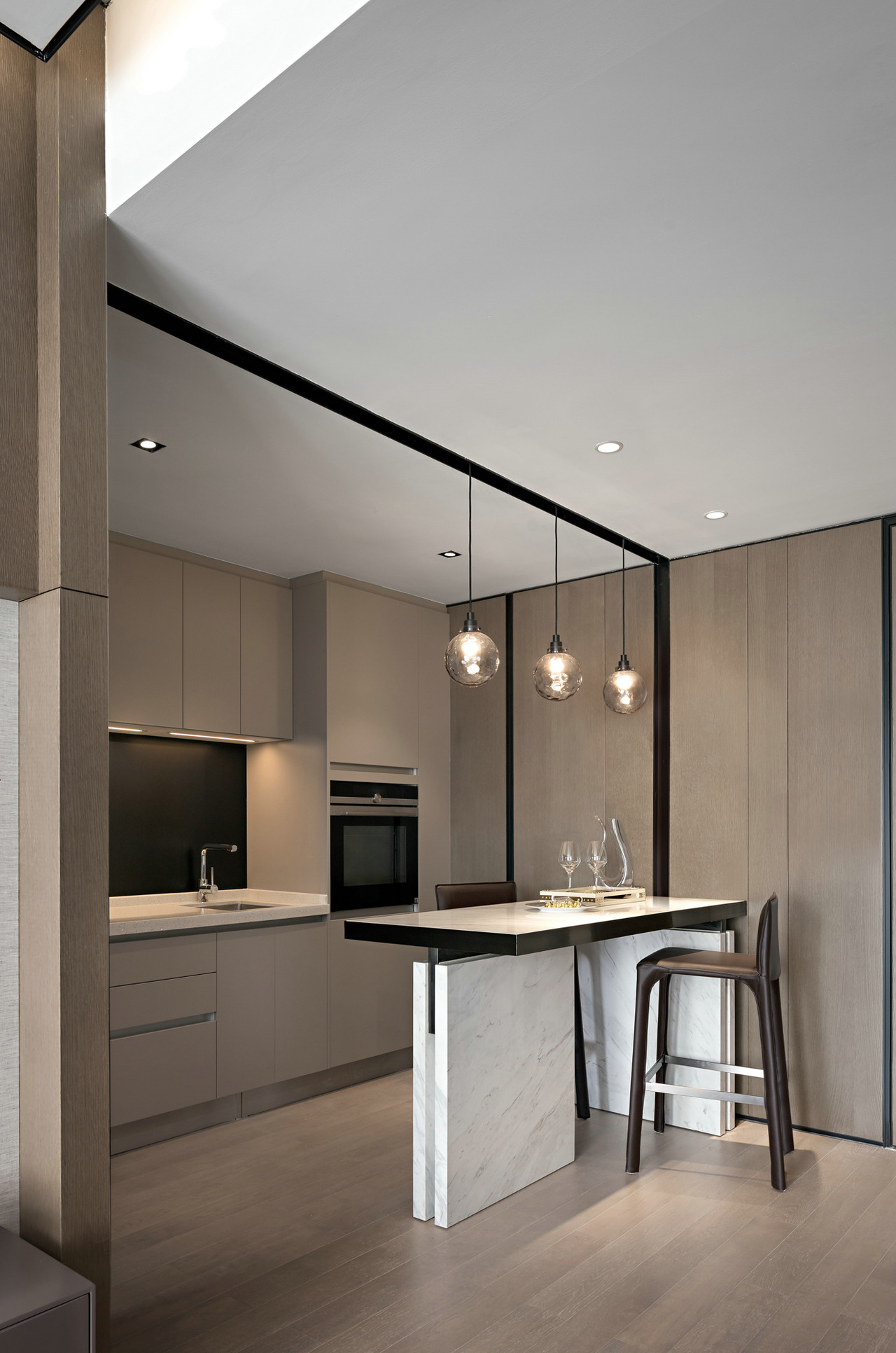 小空间的灵活在餐厅中展现无遗,对坐的吧台,轻松惬意。气泡型吊灯刚好照顾到每一餐需要的浪漫氛围。