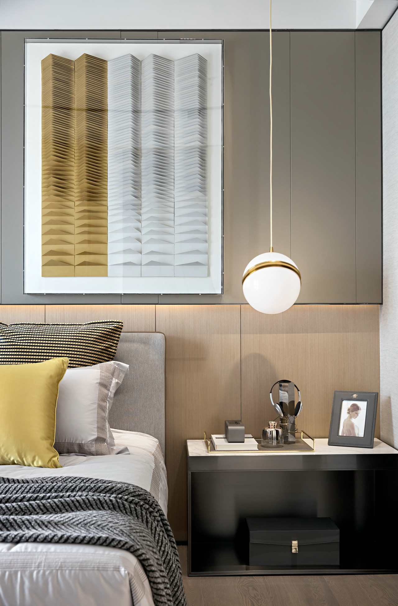 高级灰占据的卧室,弱化无足轻重的饰品,卧榻的地位被凸显无疑。墙面大幅绘画,选用弗洛伊德式的“梦”主题,如同一扇门打开远方。