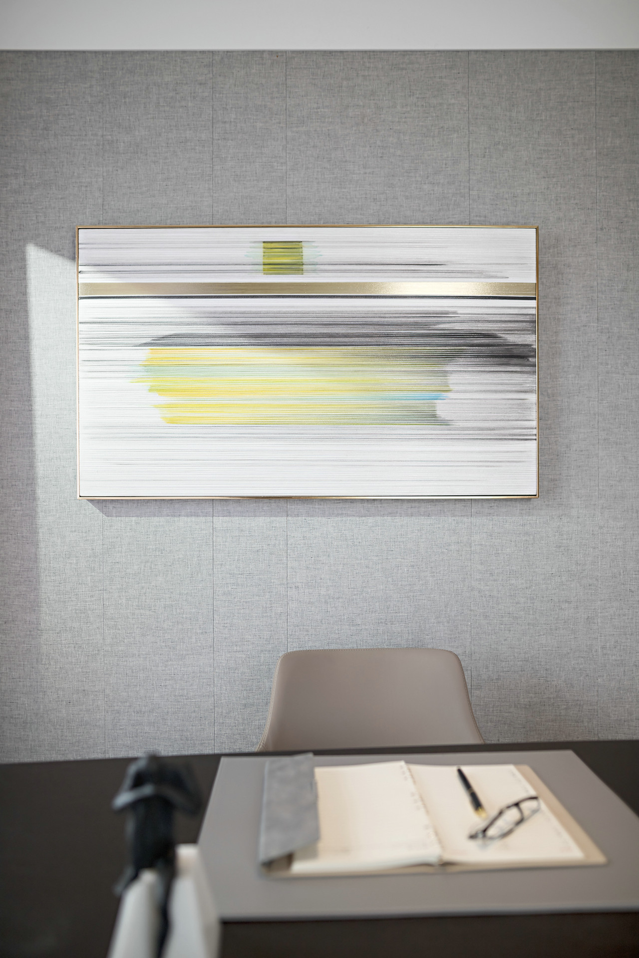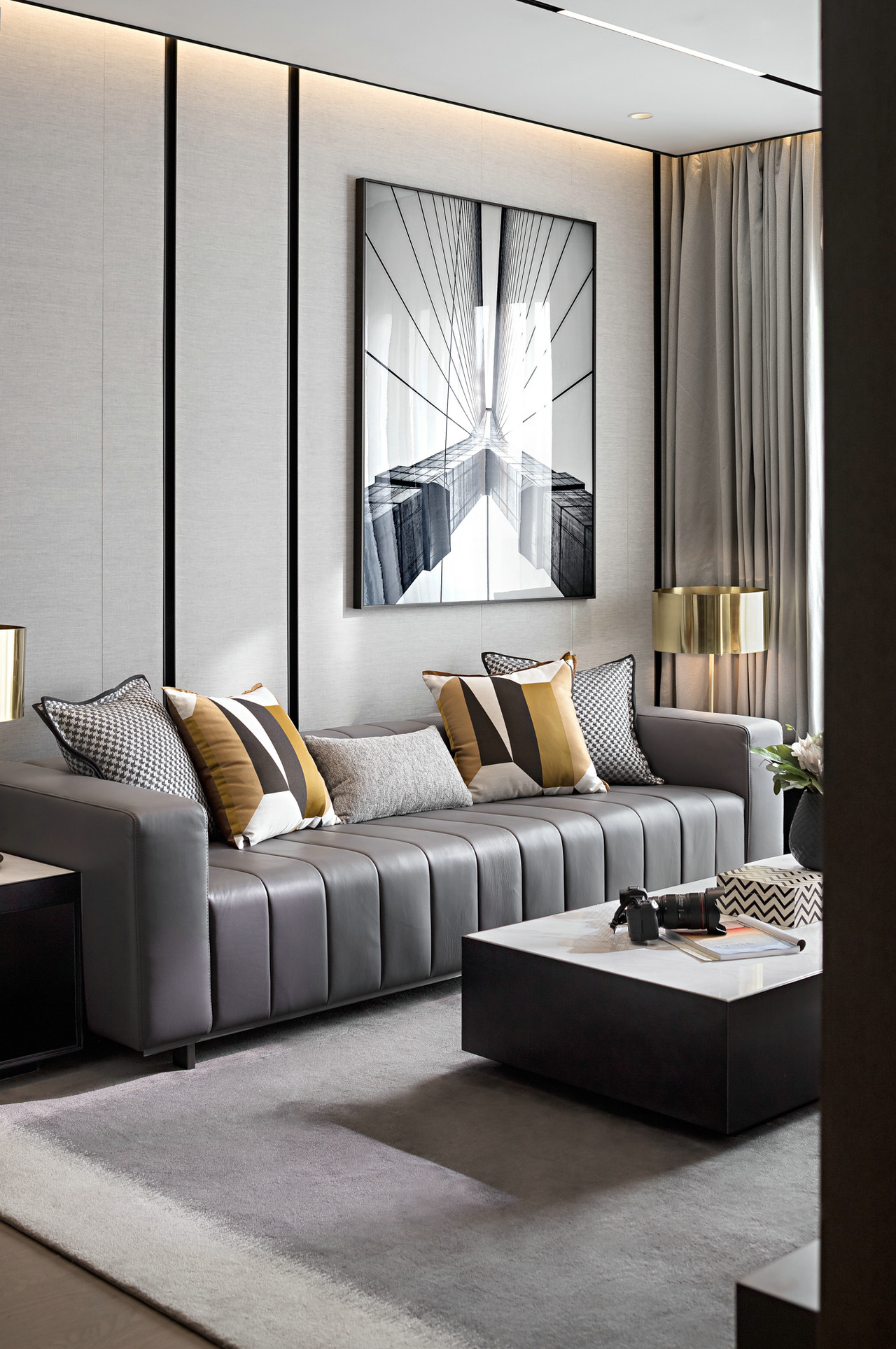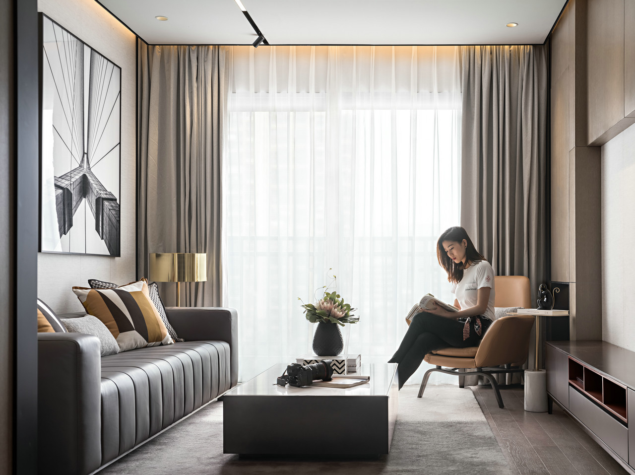 每一条线都经过精心设计,横线的平稳,竖线的冷静,纵横织就了现代空间的节奏感。与之对比的是背景墙上的大幅铁桥摄影的线条发散出的张力。