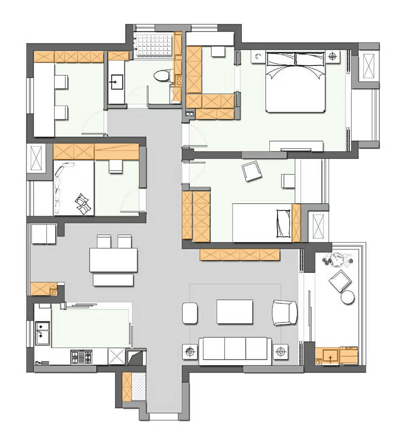 中性百搭的灰色系,如同一张洁白的画纸,等待着以后屋主生活的点缀。高级灰的背景下加入橙色系,这样的配色打破了传统绅士的循规蹈矩,不再固守传统和身份认同。