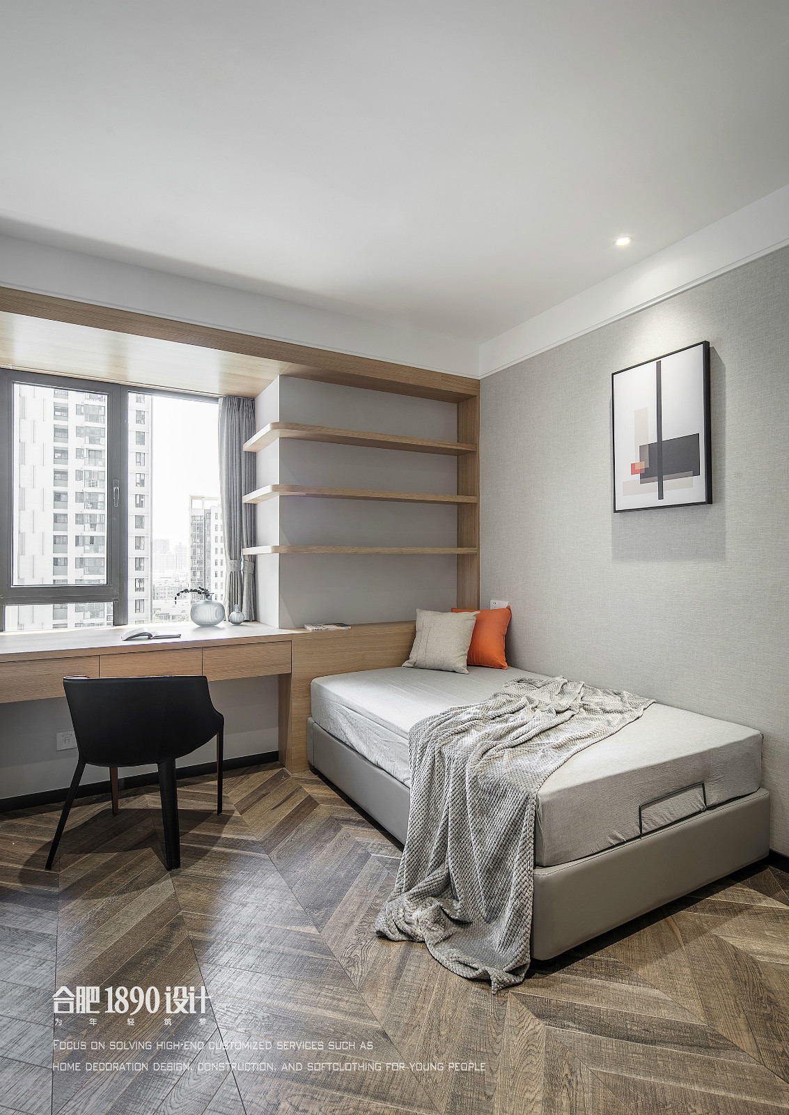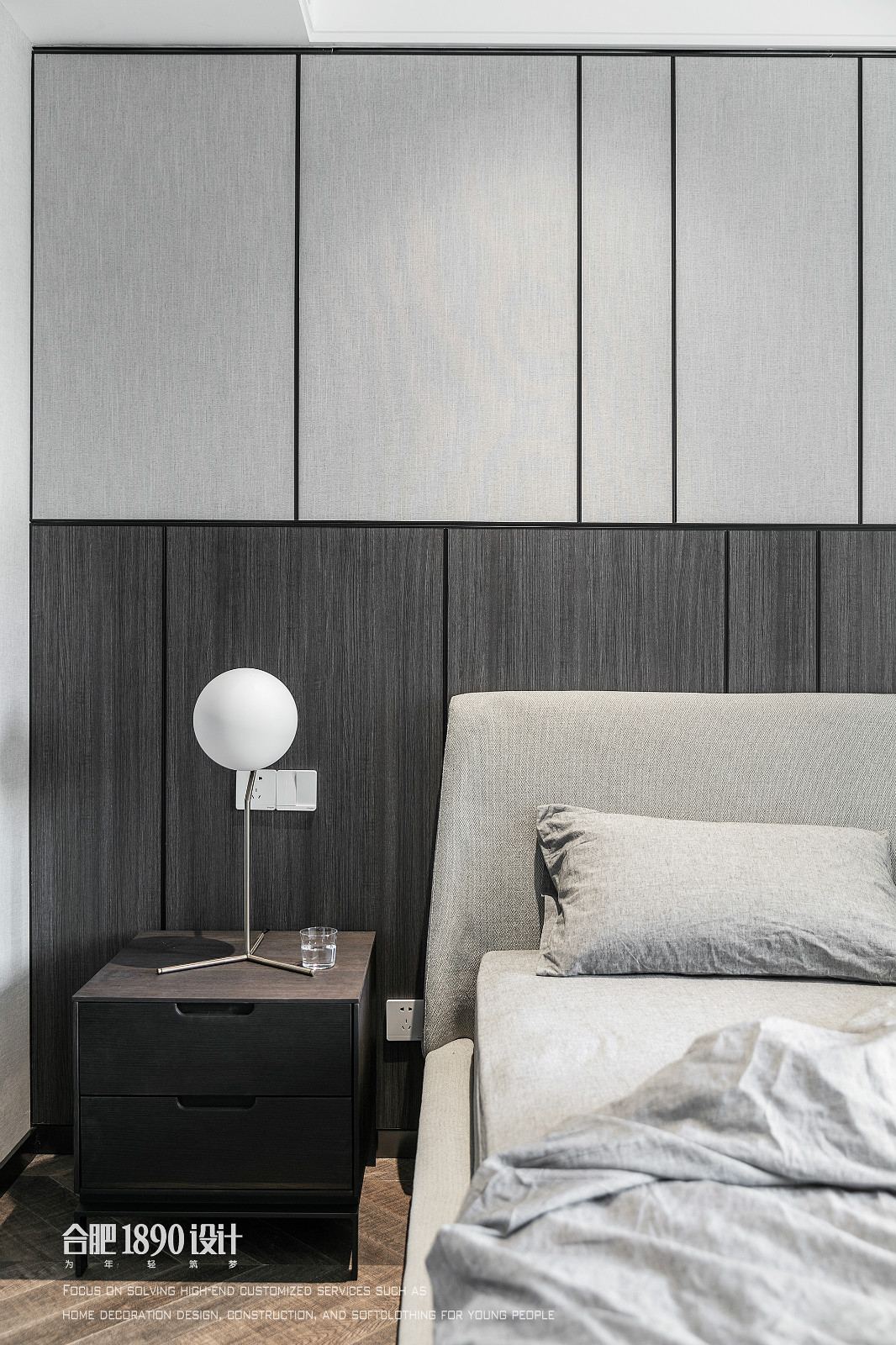 卧室整体风格延续了公区一致格调,高级灰的色调下,让空间气质十足,不同造型分割的布墙布系统背景墙为空间增添一份稳重,阳光倾泻下来的午后,让卧室更为温馨。