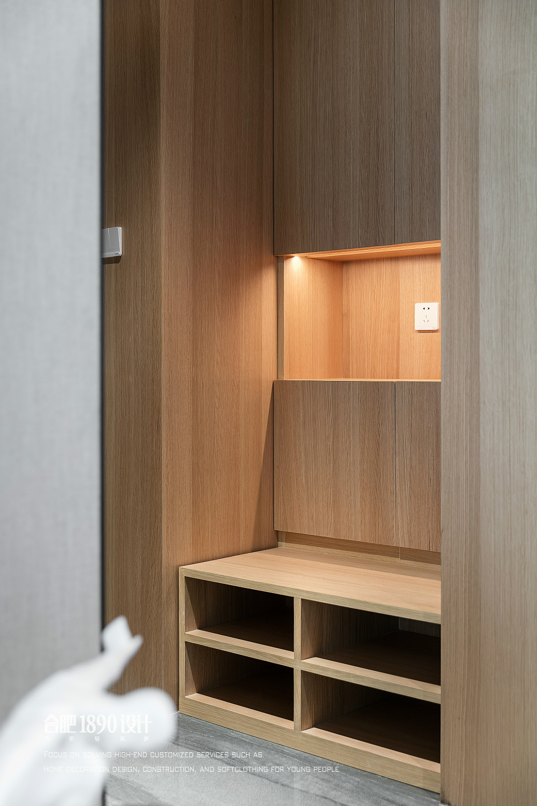 利用入户玄关的凹口,做了一组收纳柜,及可以移动的换鞋凳,换鞋凳也可以充当平时日用的收纳功能,一举多得。