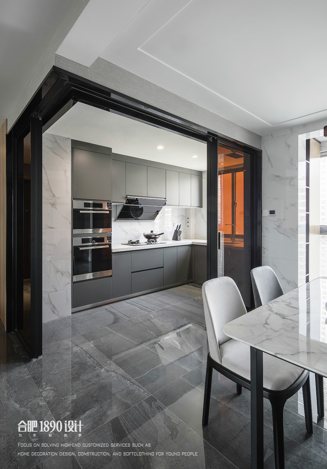 厨房内、餐厅外,餐厨内外,一扇移门将原有不足的空间,摇身一变,变得趣味,通透,高级时尚。