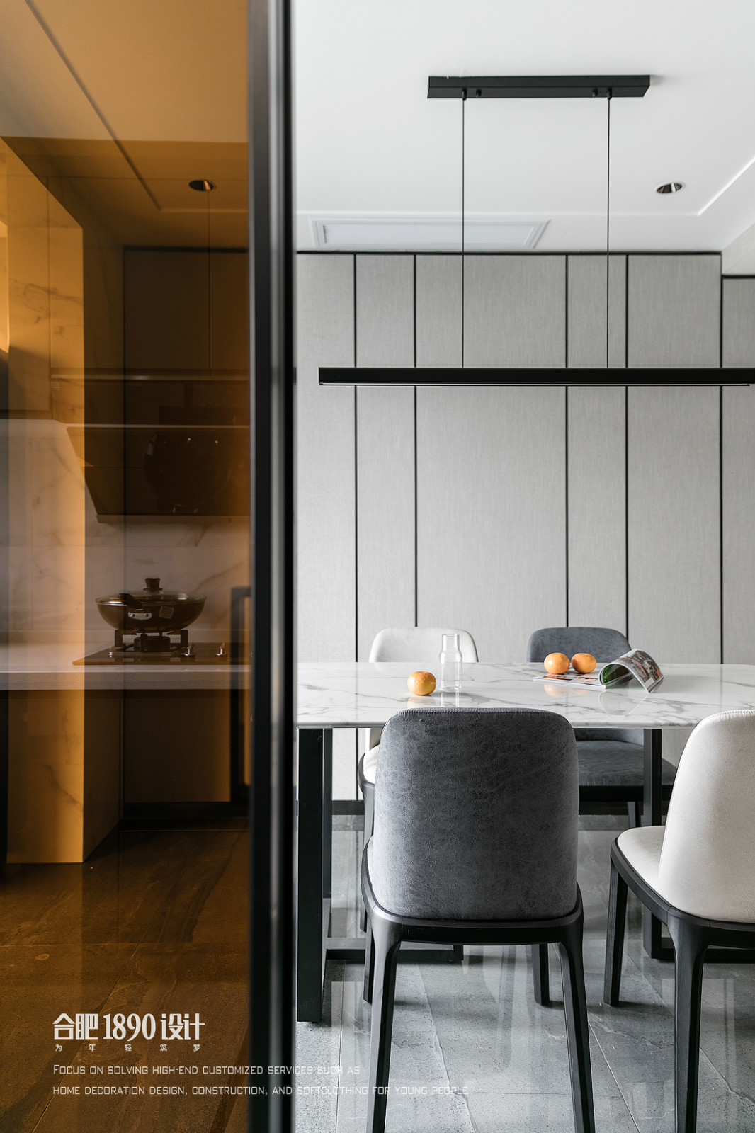 高级灰的布墙布系统,不同分割的金属线条点缀,提升空间的耐看度与品质感,极简的餐厅吊灯,聚焦视线,让空间更有层次。